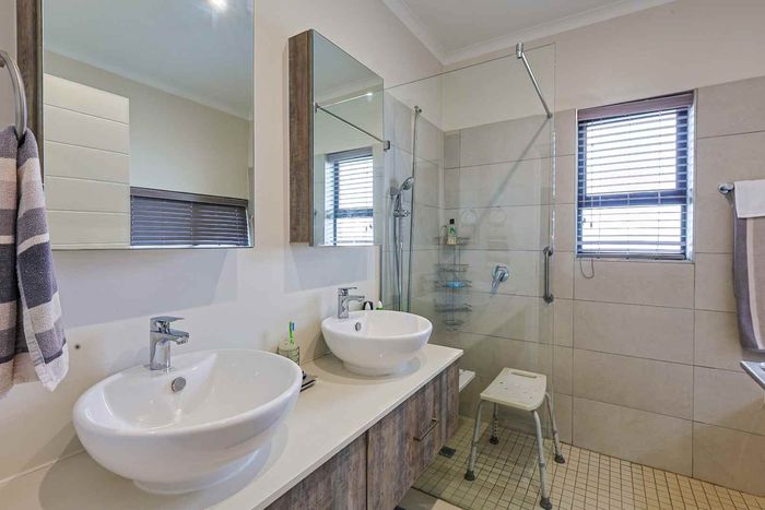Resort-style estate living in The Retreat with scenic walkways, pools and Meadows views; open-plan kitchen and covered patio with built-in braai overlooking a garden. Two bedrooms, two baths, double garage.