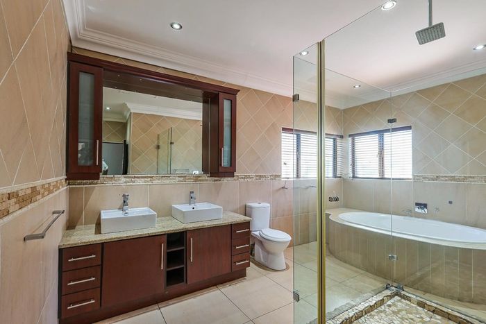 Enjoy effortless entertaining by the pool and enclosed braai room in a family-friendly neighbourhood, plus modern kitchen, solar backup, four bedrooms, 3.5 baths and two garages.
