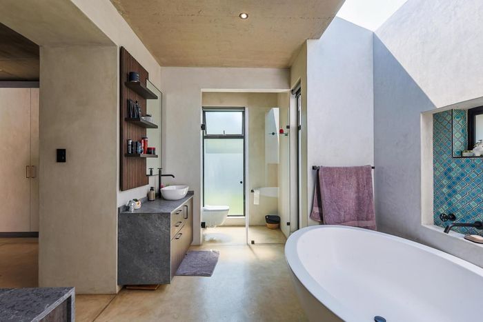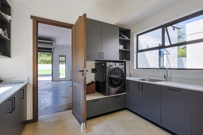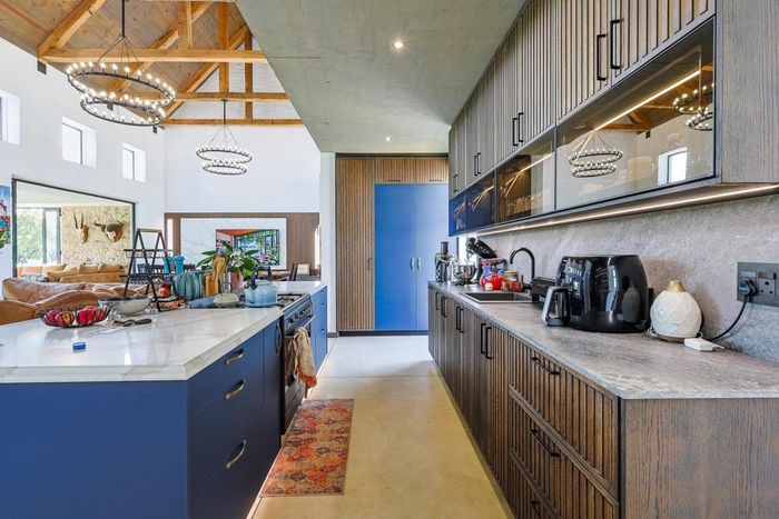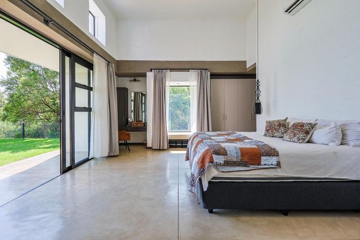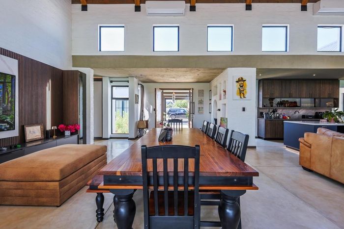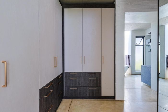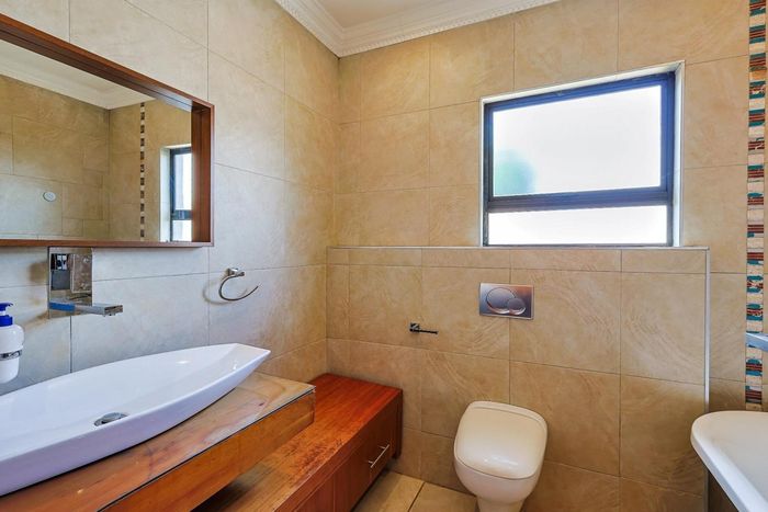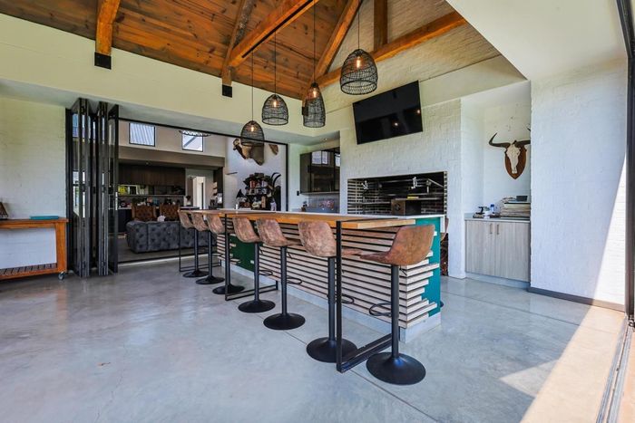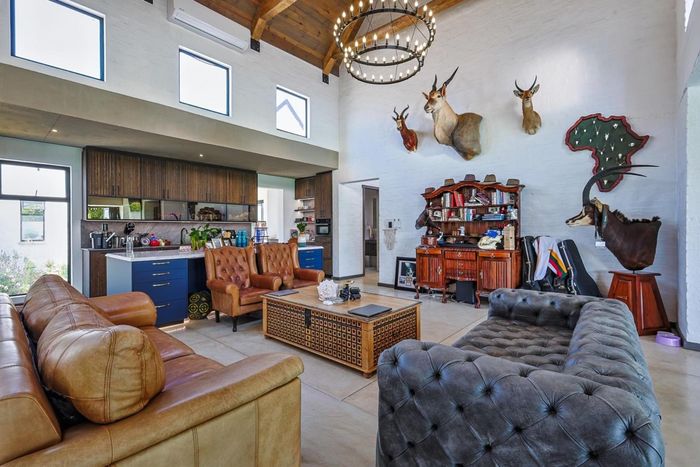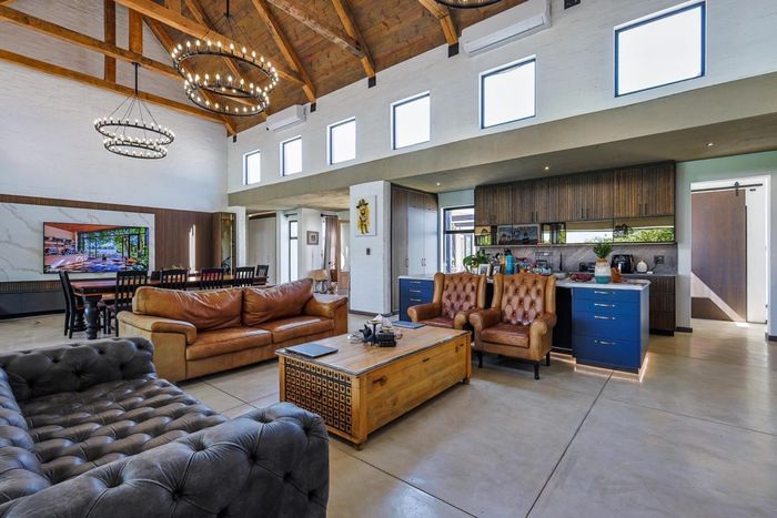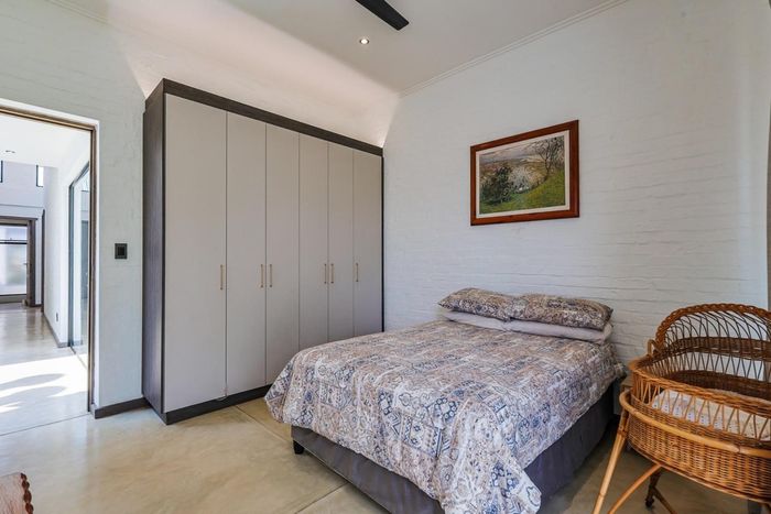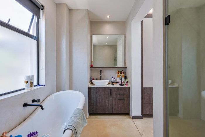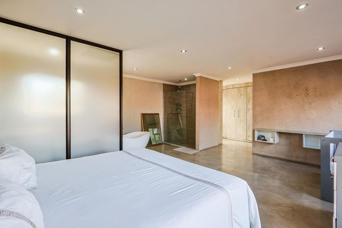Elevated designer living in Privage Estate with panoramic Waterkloof Ridge views, expansive balcony with built-in braai and cozy fireplace — includes four bedrooms, guest suite and double garage.