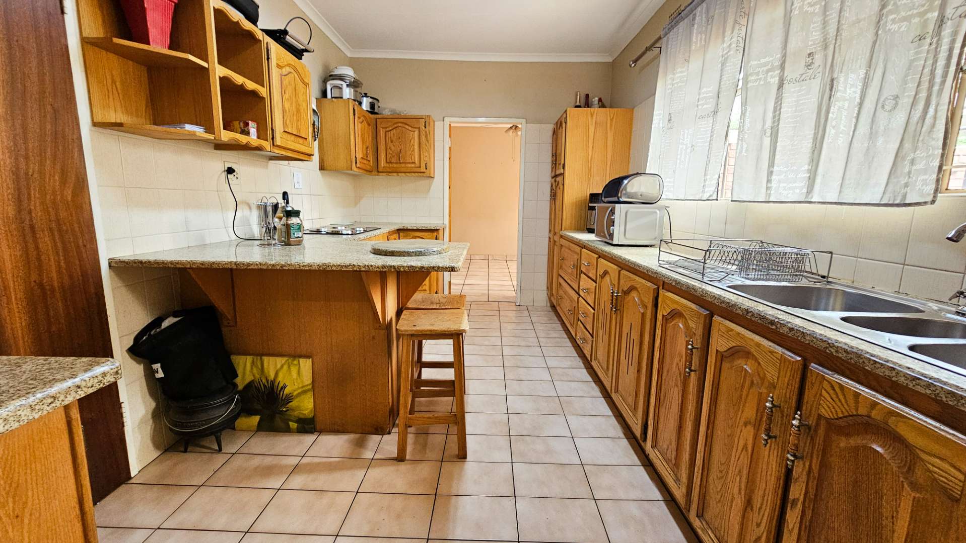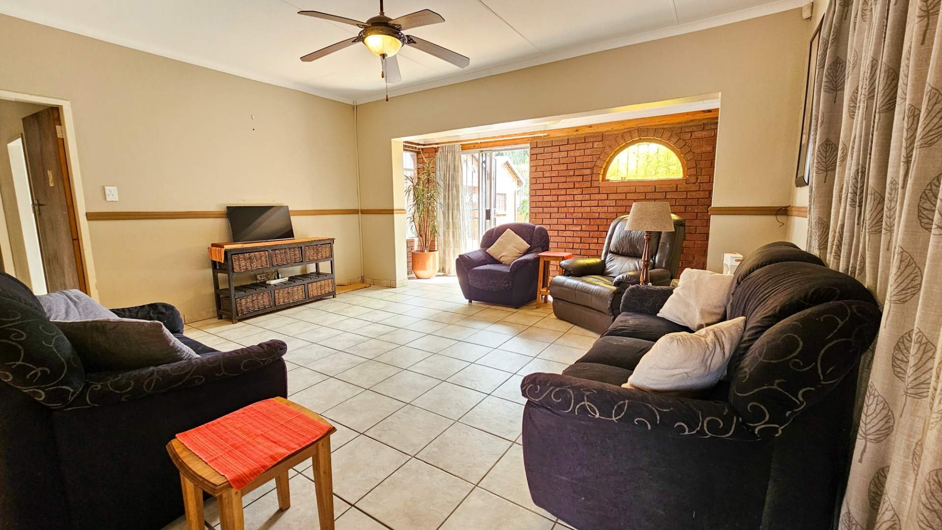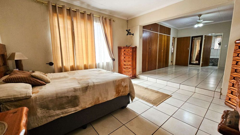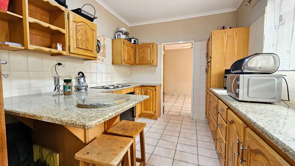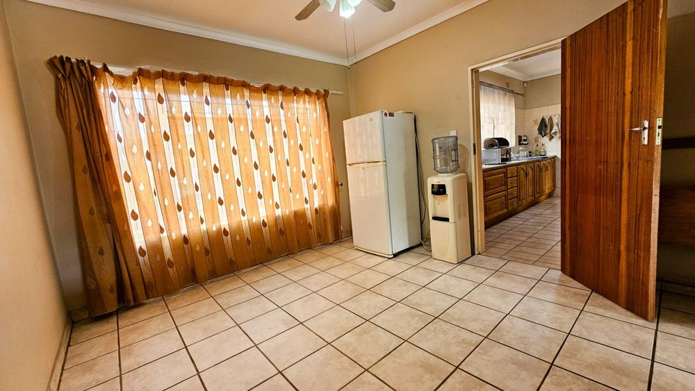 The home flows seamlessly through a spacious living/TV room and dedicated dining area, leading into a well-appointed kitchen with ample cupboard space and a separate scullery – perfect for keeping things neat and functional.