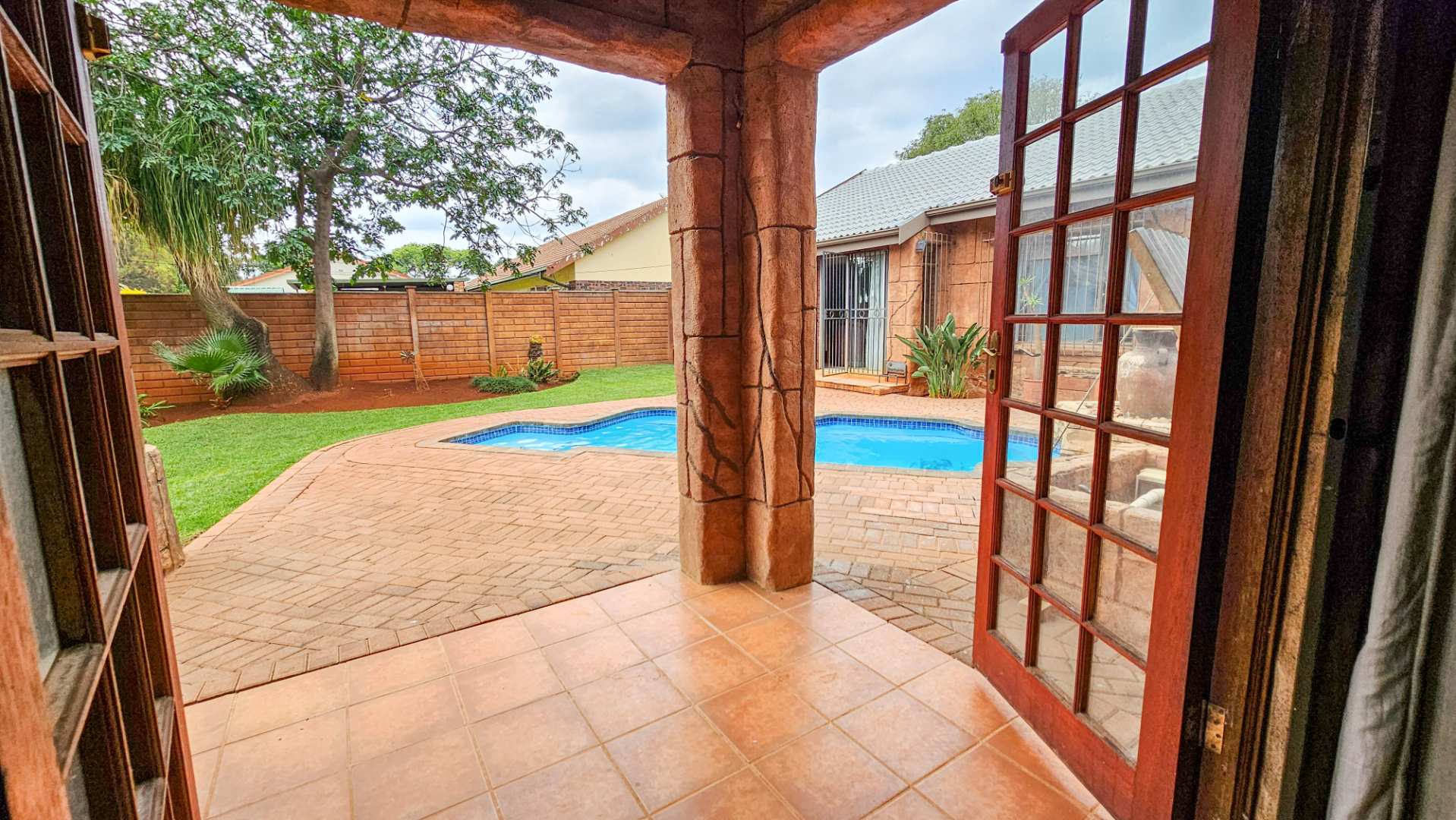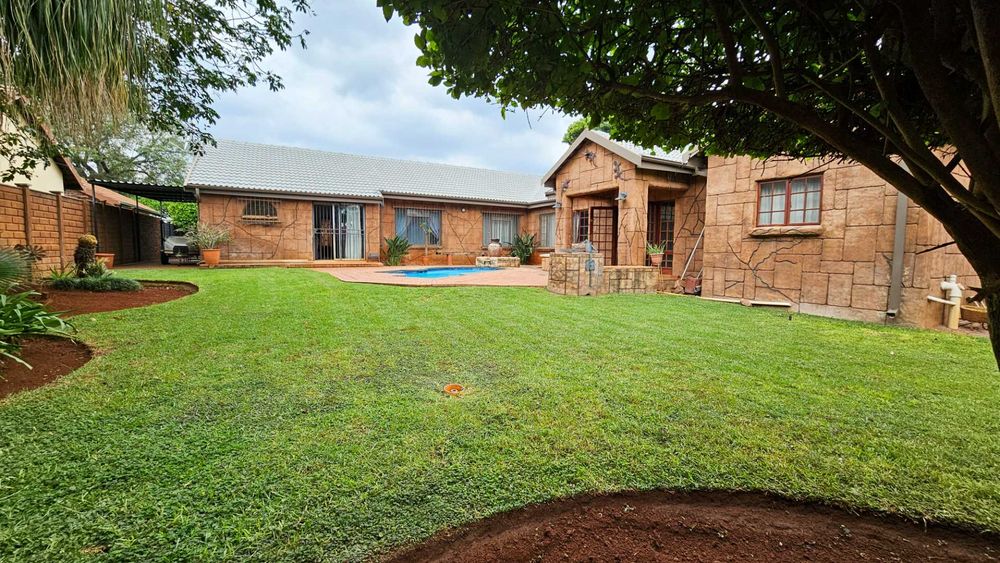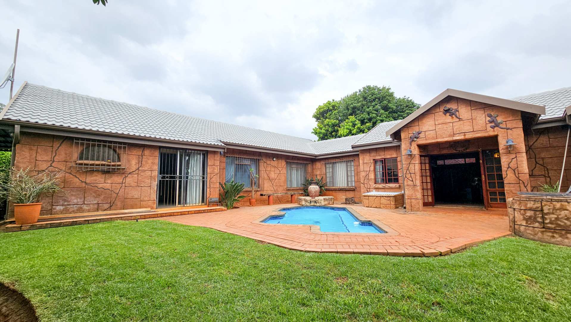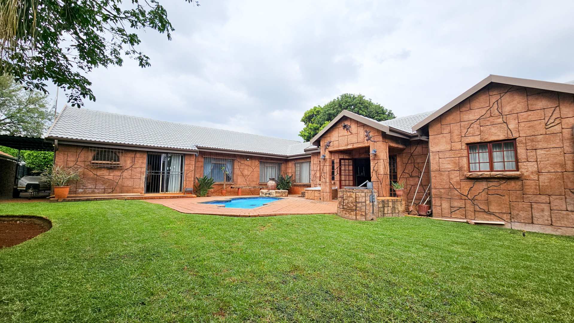 A covered courtyard, a lush beautifully maintained garden fed by a borehole, and a sparkling swimming pool set the tone for relaxed outdoor living.