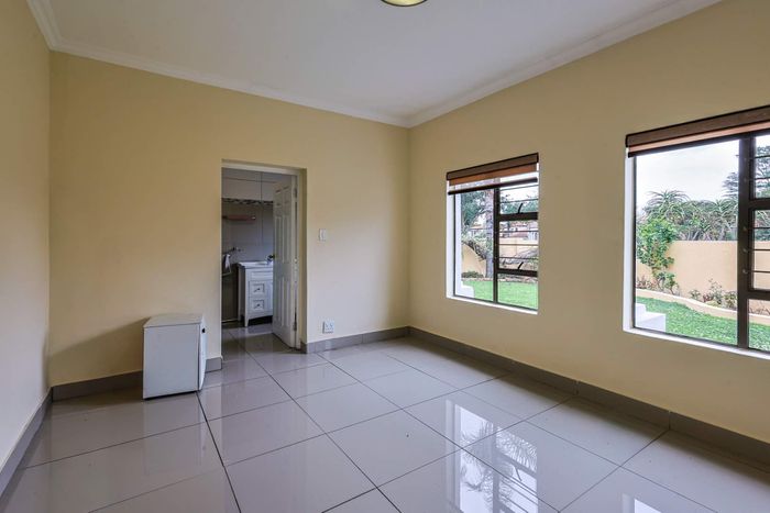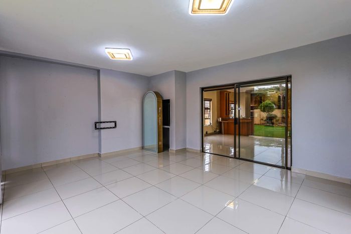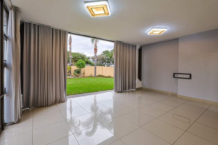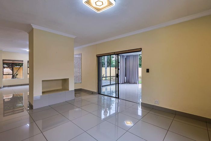Live where business and leisure meet in Menlyn/Atterbury — palm-shaded private retreat with sunlit open-plan living, patio with built-in braai and lush garden; three beds, 2.5 baths, double garage.