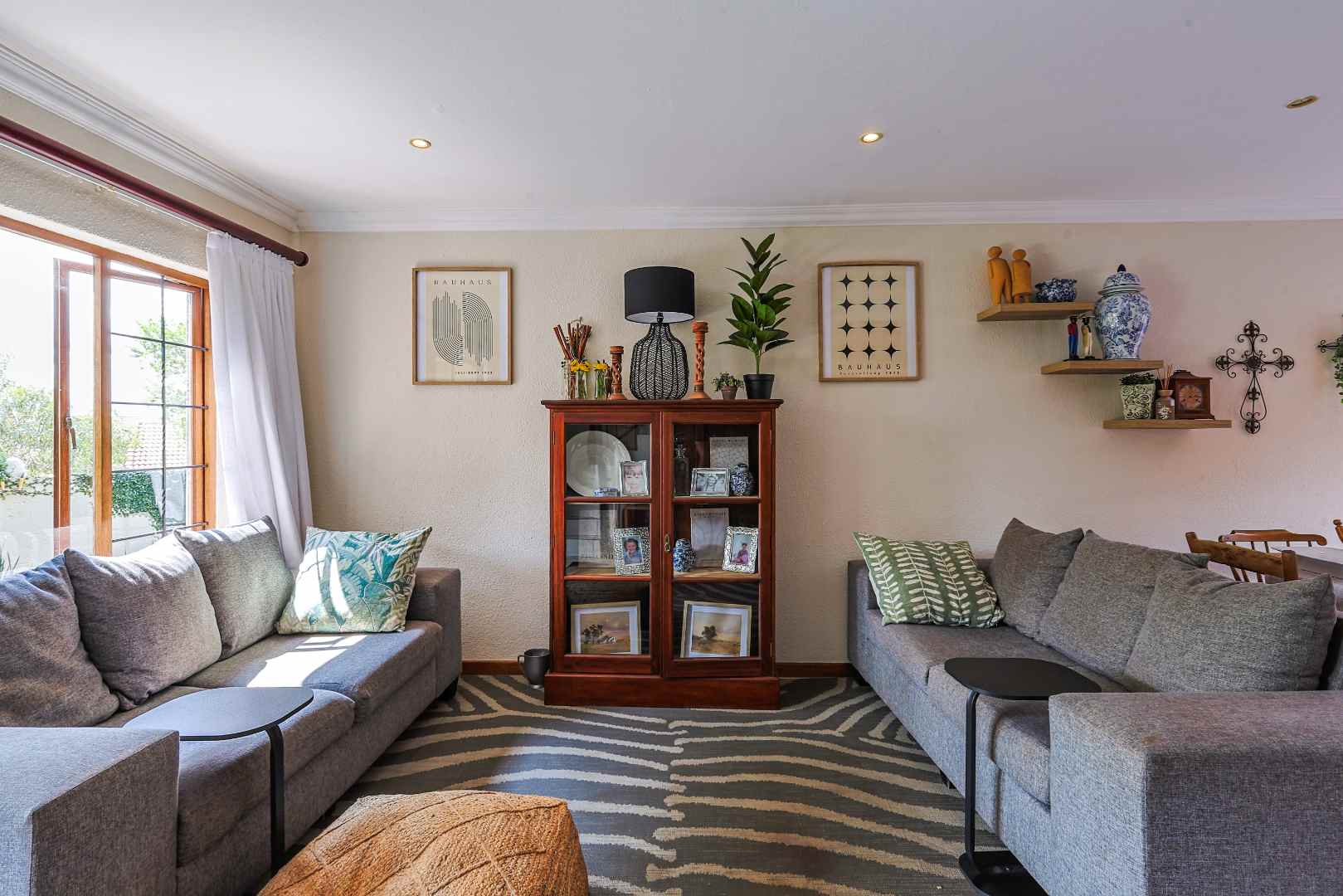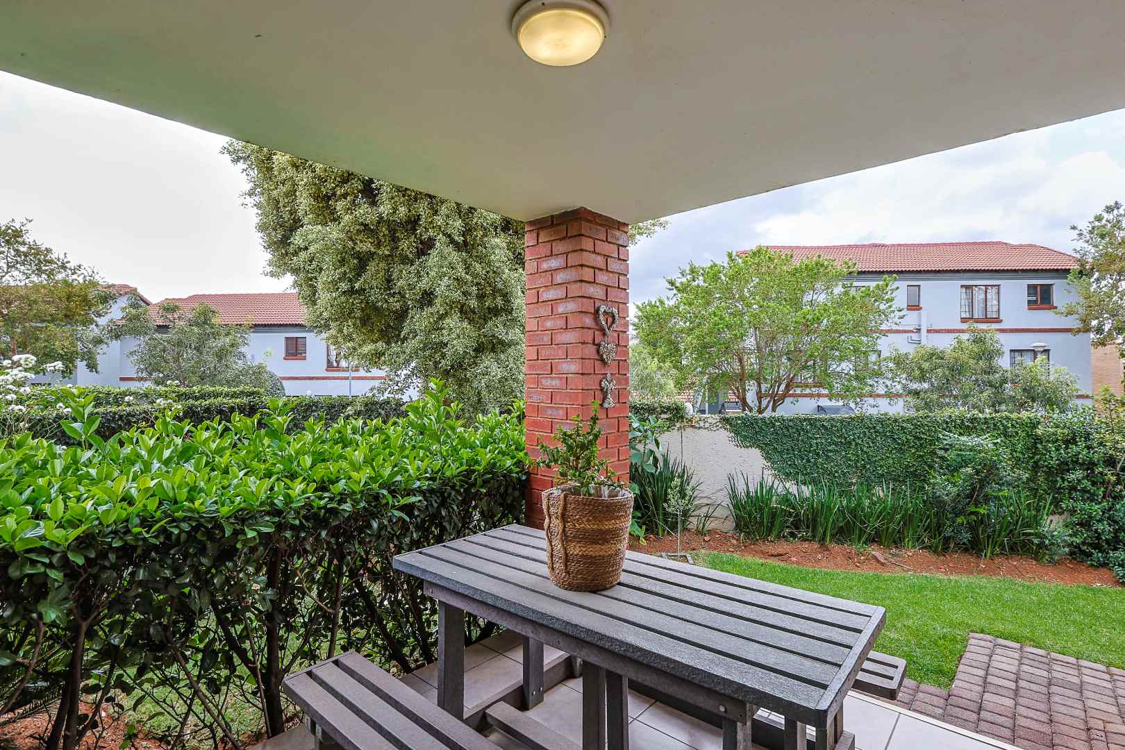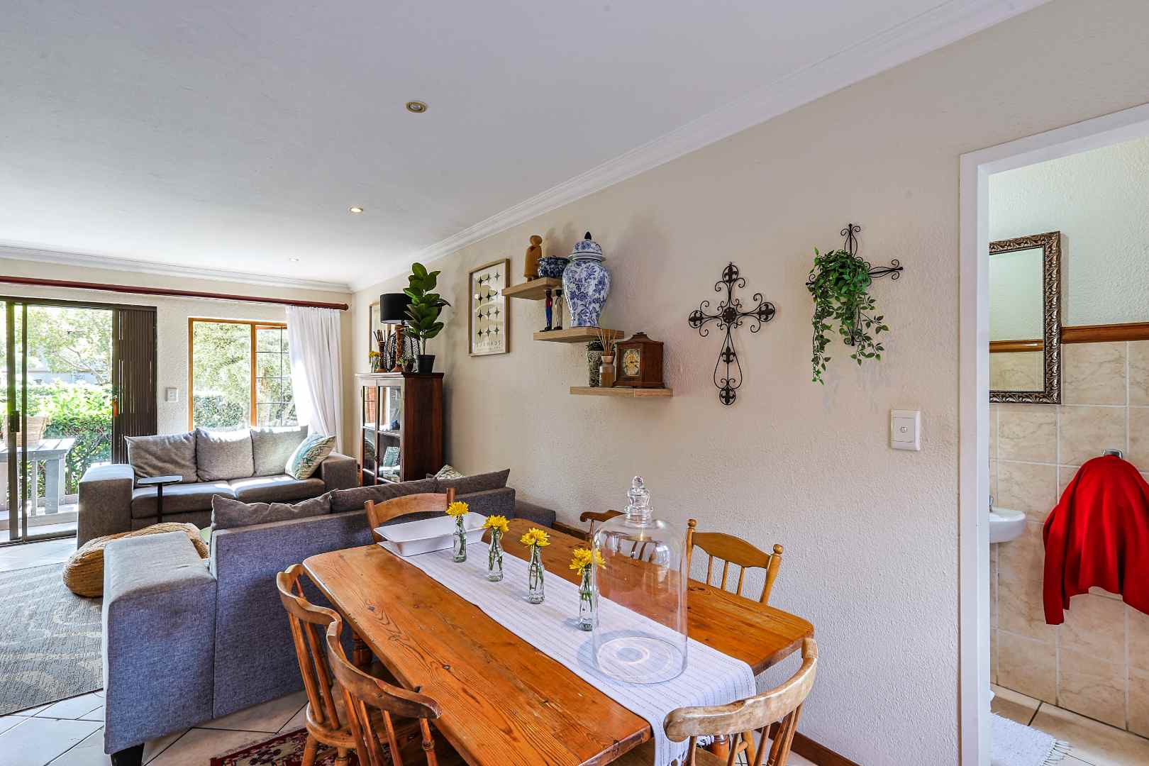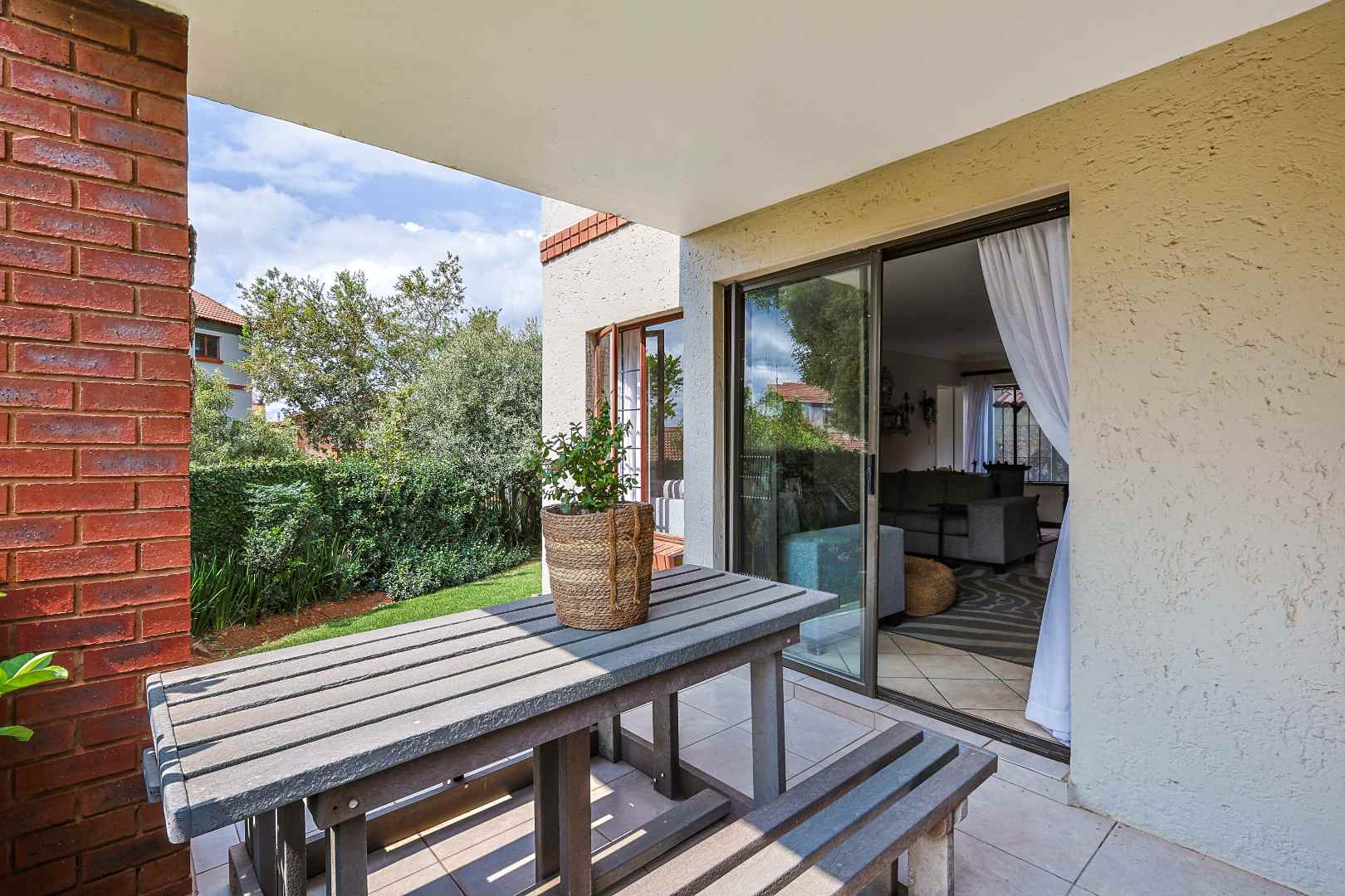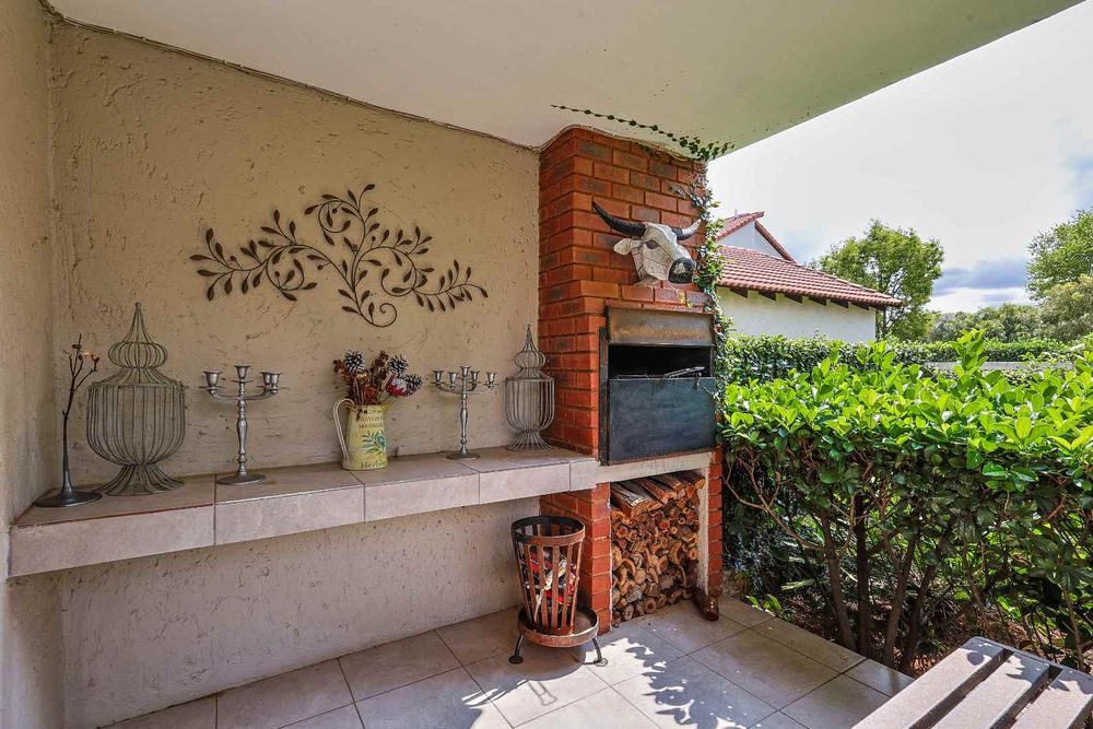 These living spaces flow seamlessly onto a generous patio with a built-in braai – ideal for entertaining family and friends while enjoying the tranquility of your lush, private garden.