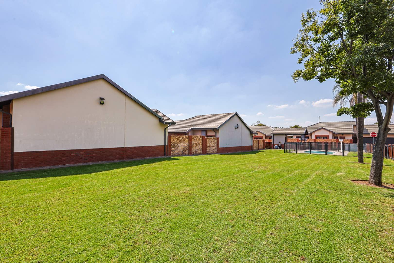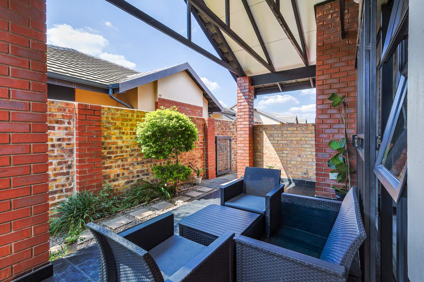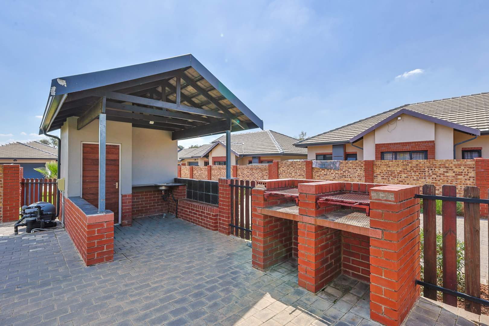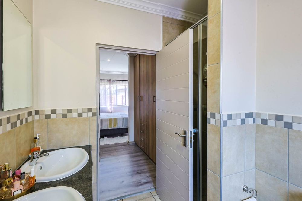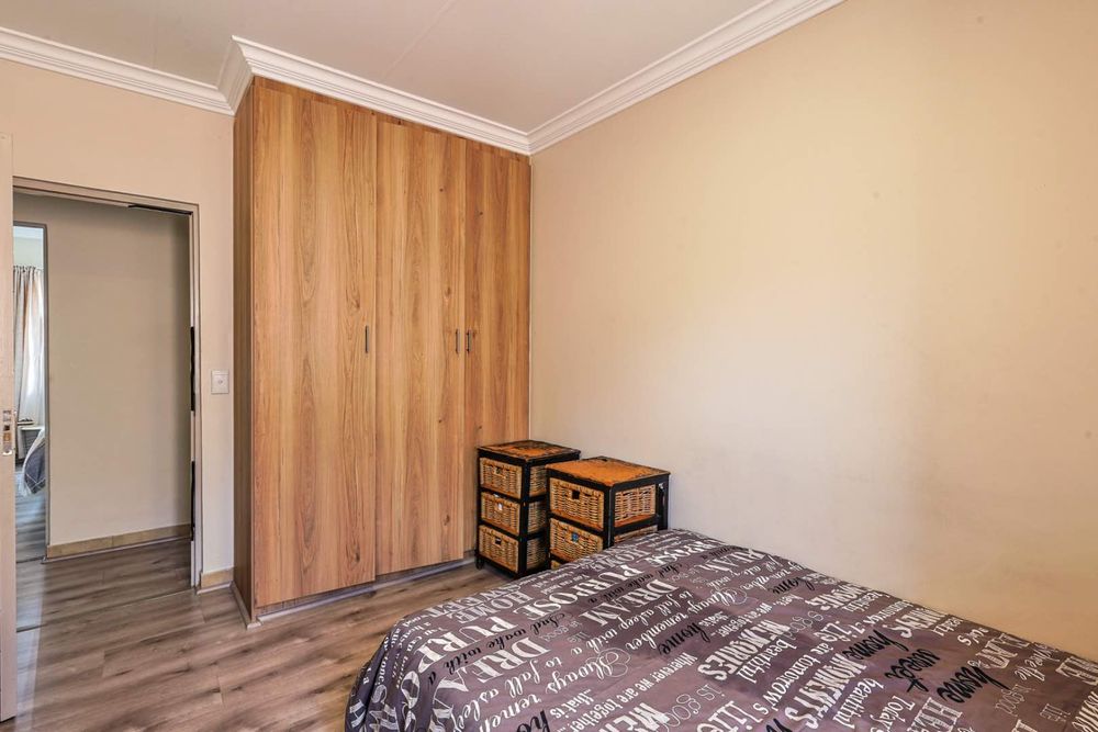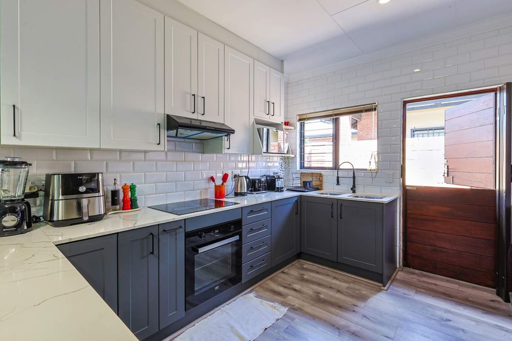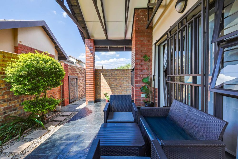 Upon entering, you are greeted by a clean-cut, open-plan kitchen that seamlessly flows into the spacious TV room. This inviting space is perfect for entertaining guests or enjoying cozy family evenings. The TV room opens up to a delightful patio, where you will find a built-in braai, perfect for hosting and outdoor gatherings. Beyond the patio lies a well-maintained, small garden, providing a serene outdoor retreat.