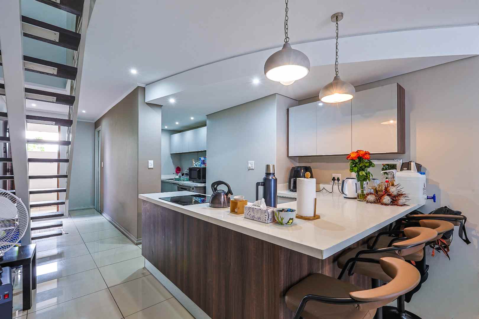 Downstairs features a guest toilet and a spacious open-plan kitchen and living area that leads onto a private balcony—perfect for relaxing or entertaining. The kitchen is fitted with granite countertops, a breakfast nook, and space for one appliance.