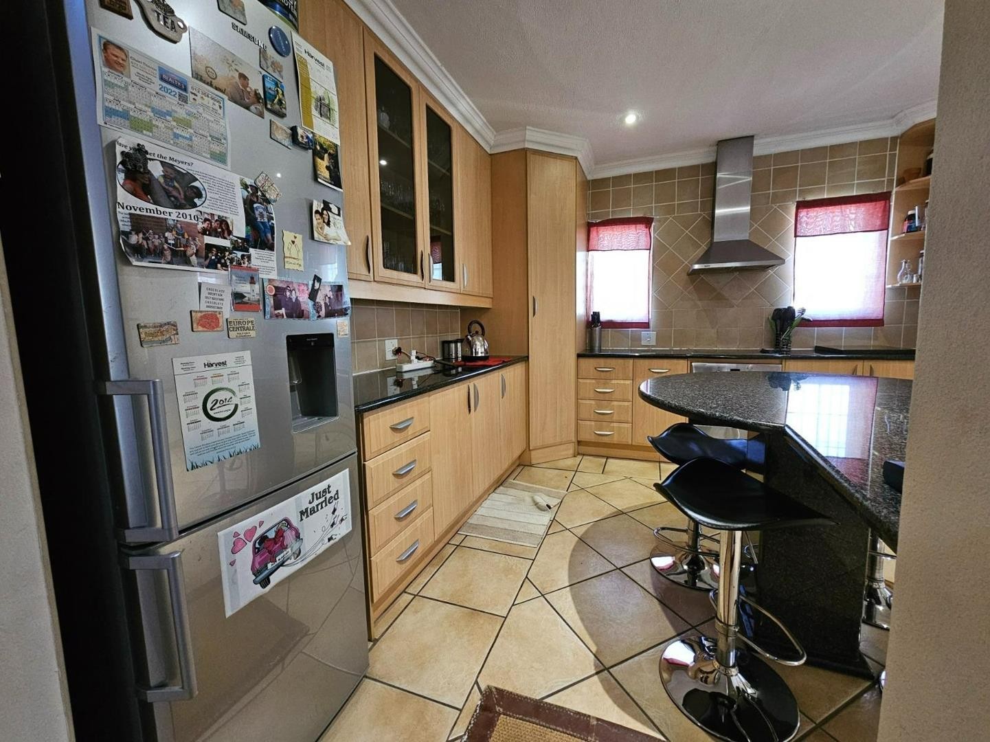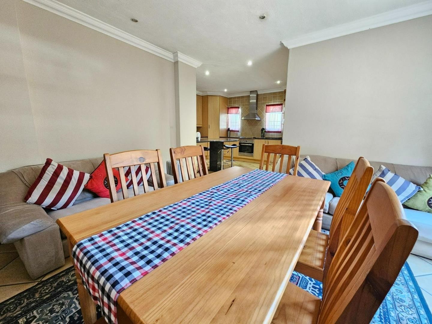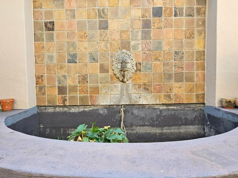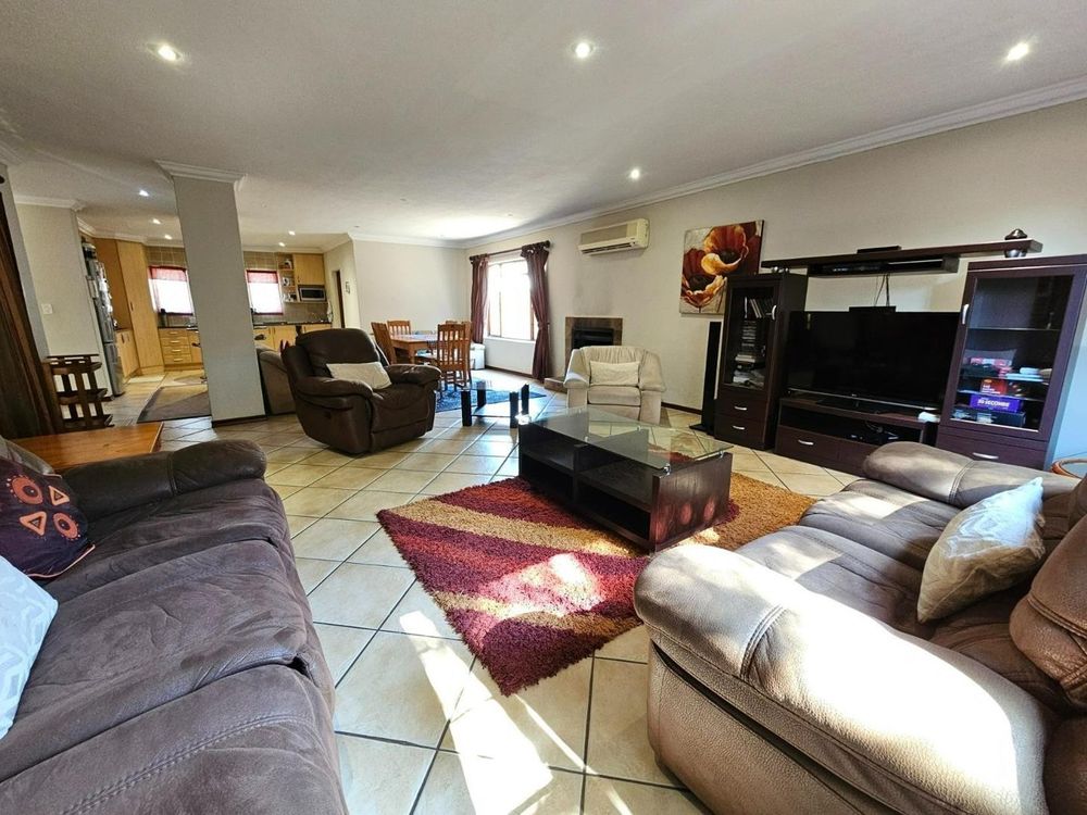Flowing seamlessly from the kitchen, the open-plan dining and living area creates a welcoming space for family gatherings. A double door opens into the enclosed braai/entertainment area with stack doors that fold away to reveal a tranquil garden section with a charming pond—perfect for hosting or simply unwinding.