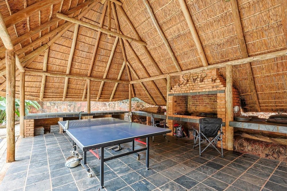 Large sliding doors flow onto an expansive covered patio, natural stone boma, and tranquil cement dam, all framed by a beautifully landscaped garden that captures the essence of serene Bushveld living.