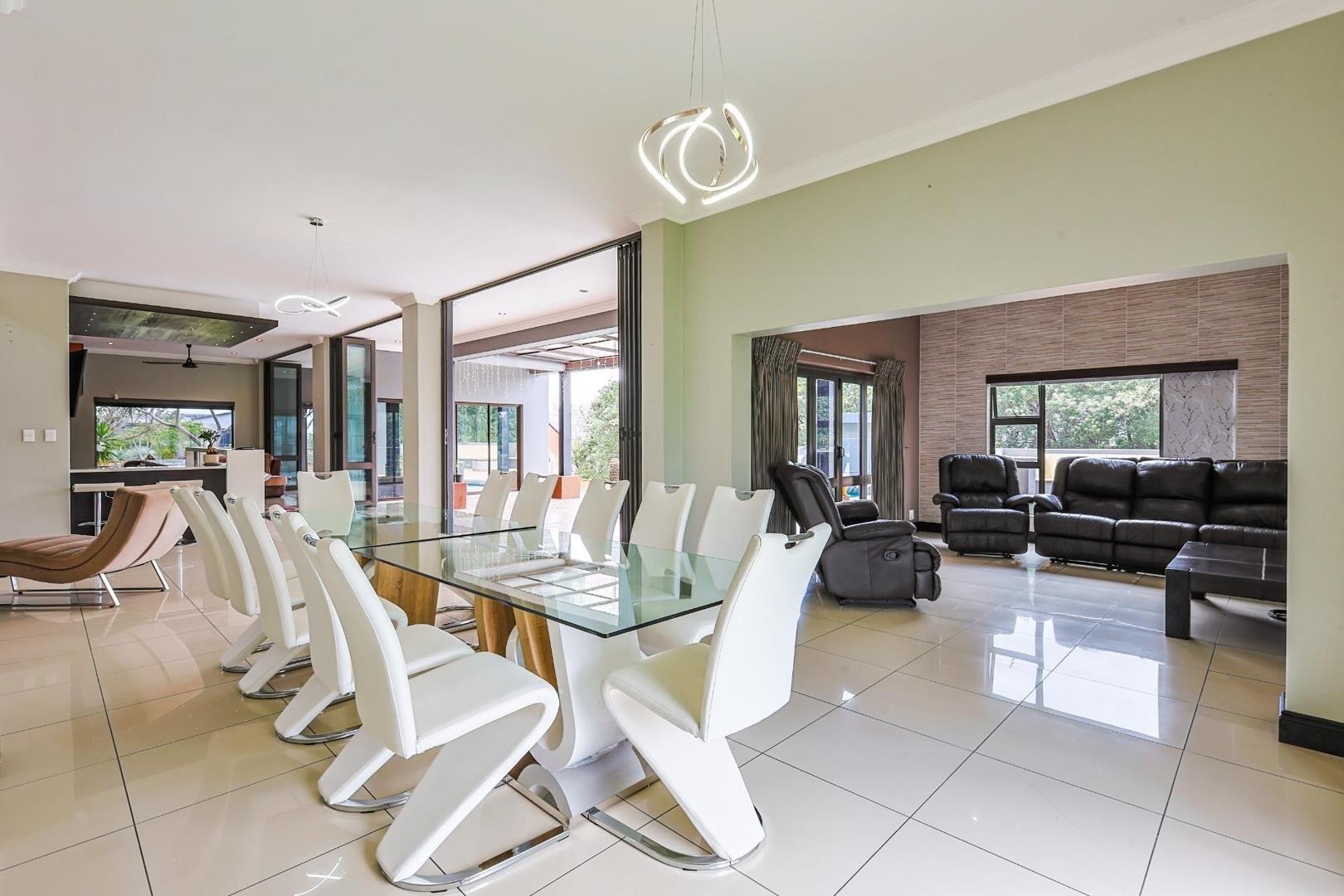 The expansive open-plan living areas flow seamlessly from the formal lounge, complete with a warm and inviting fireplace, into the generous dining space — ideal for family living and entertaining. High ceilings and large windows allow natural light to flood the home, enhancing its airy and spacious feel.