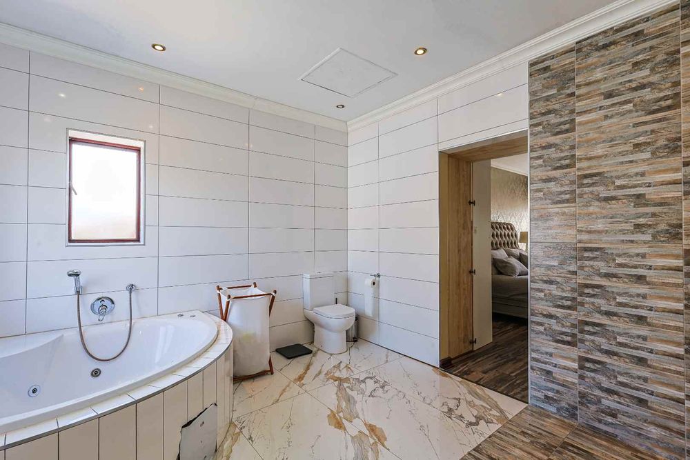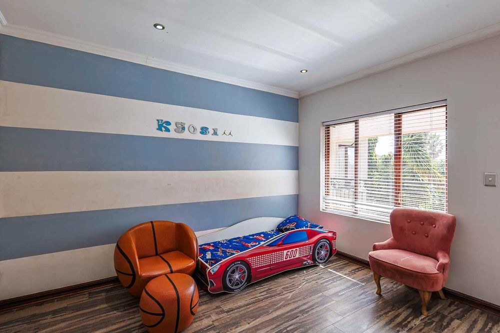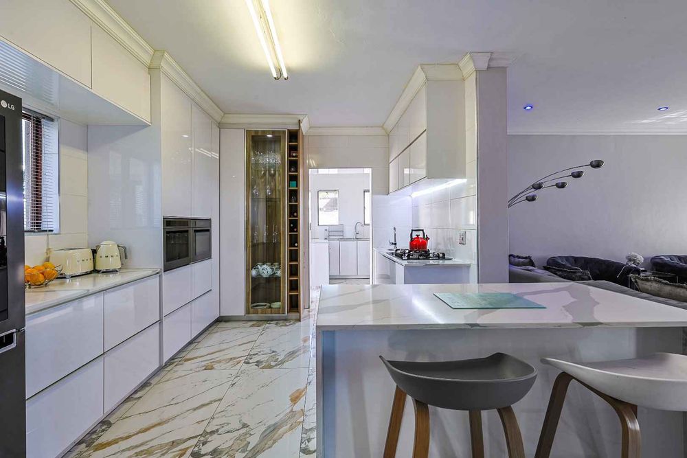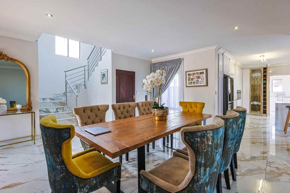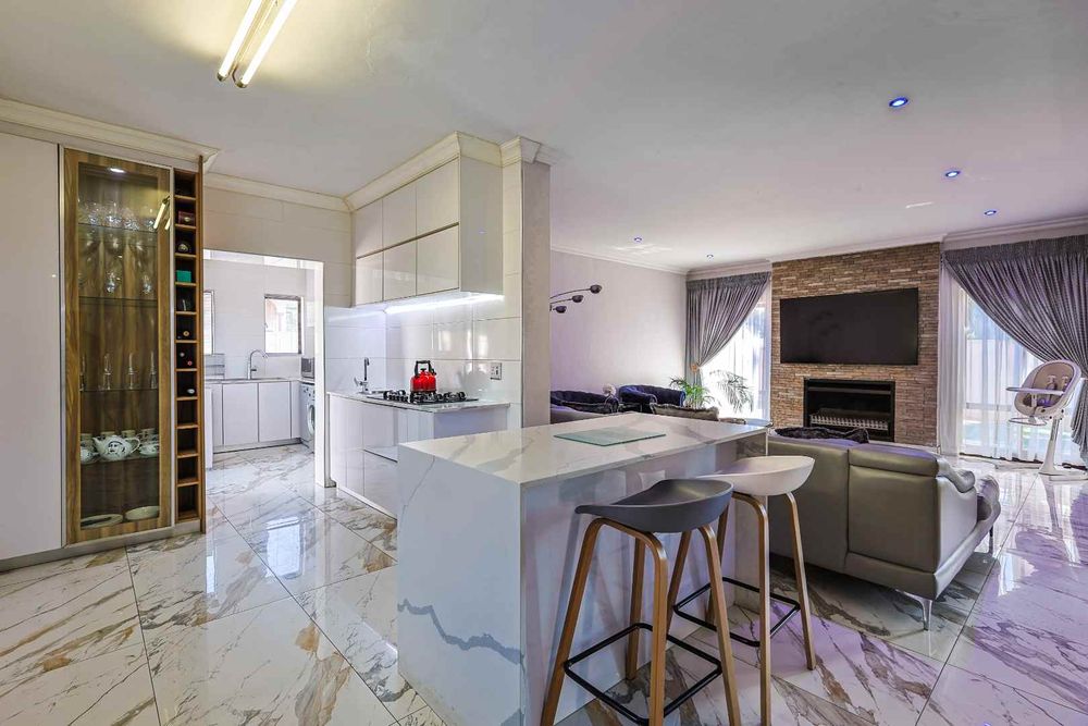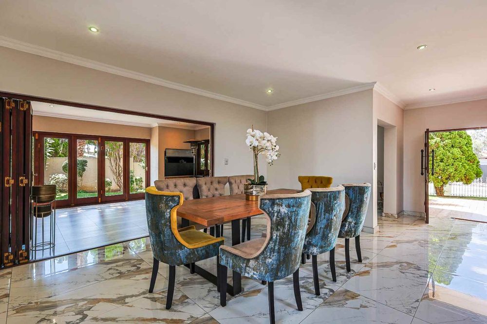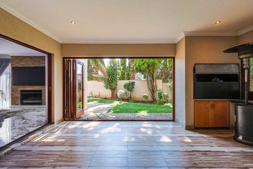 The home features an open-plan dining area that flows seamlessly into an enclosed braai room with a built-in braai. Stack doors open up to a well-maintained garden and sparkling swimming pool—perfect for entertaining.