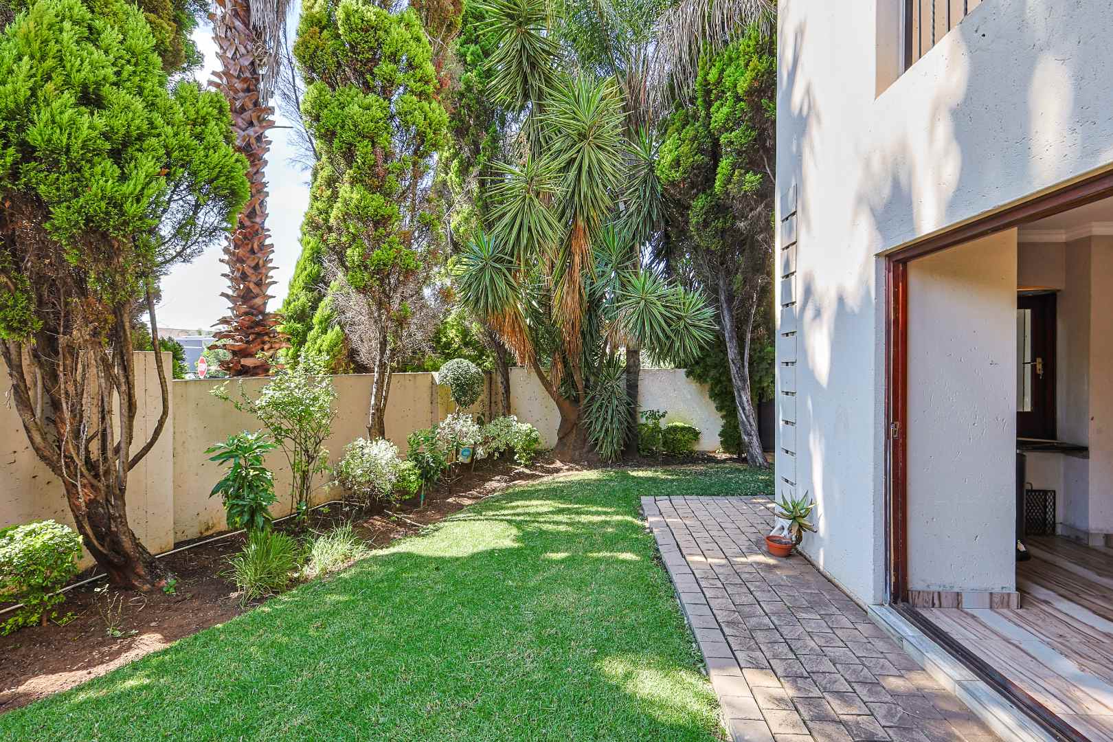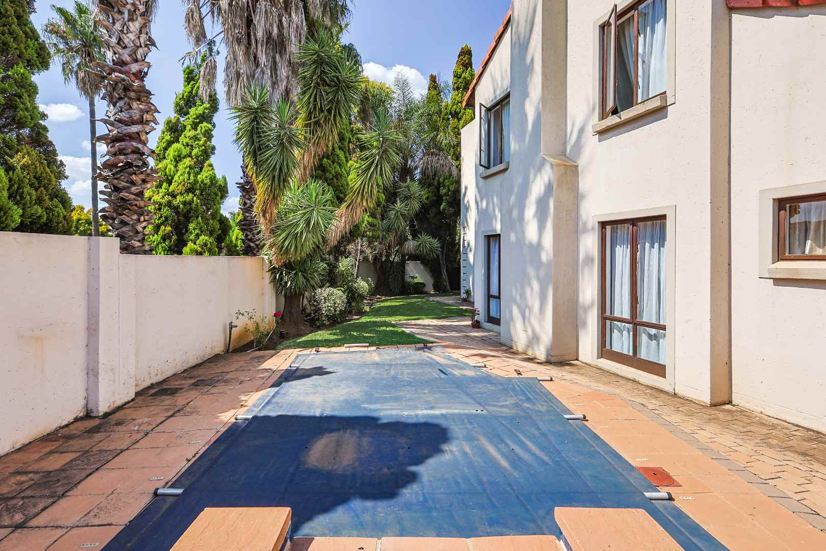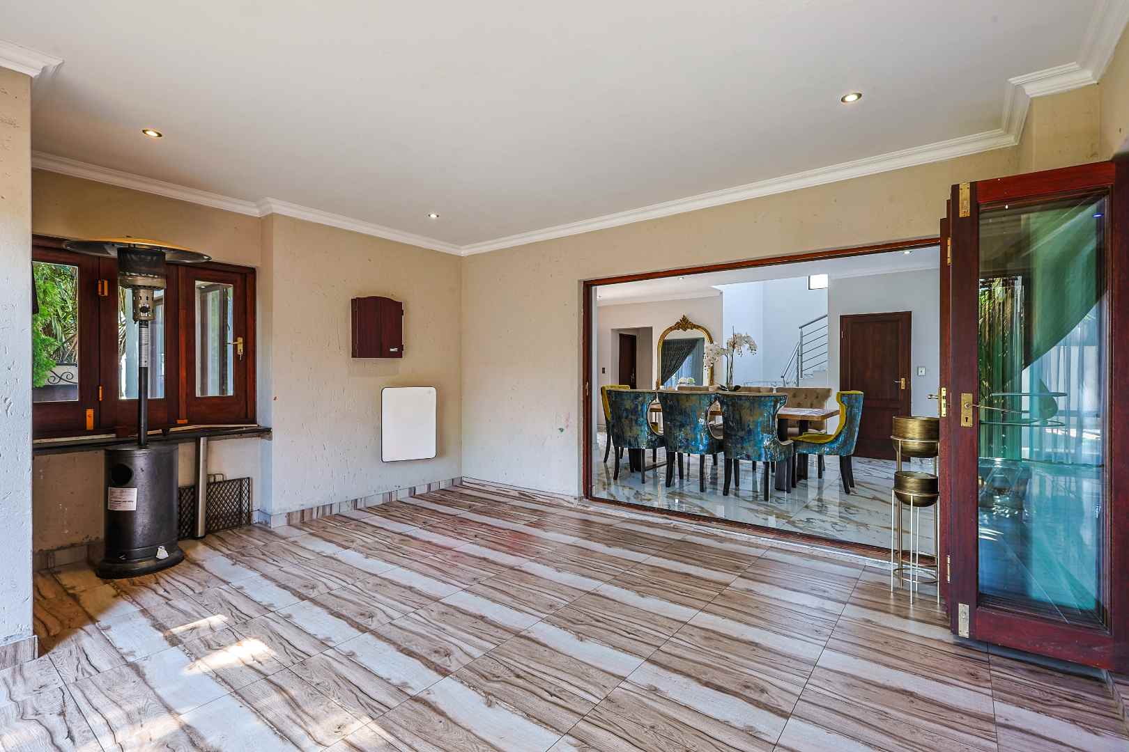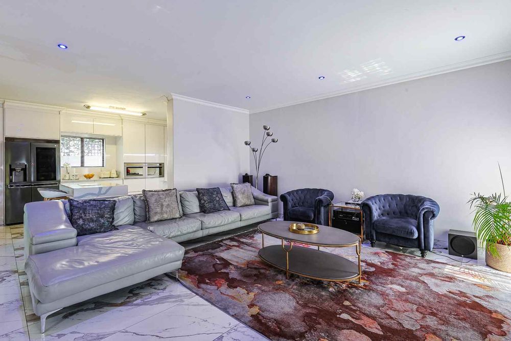 The home features an open-plan dining area that flows seamlessly into an enclosed braai room with a built-in braai. Stack doors open up to a well-maintained garden and sparkling swimming pool—perfect for entertaining.