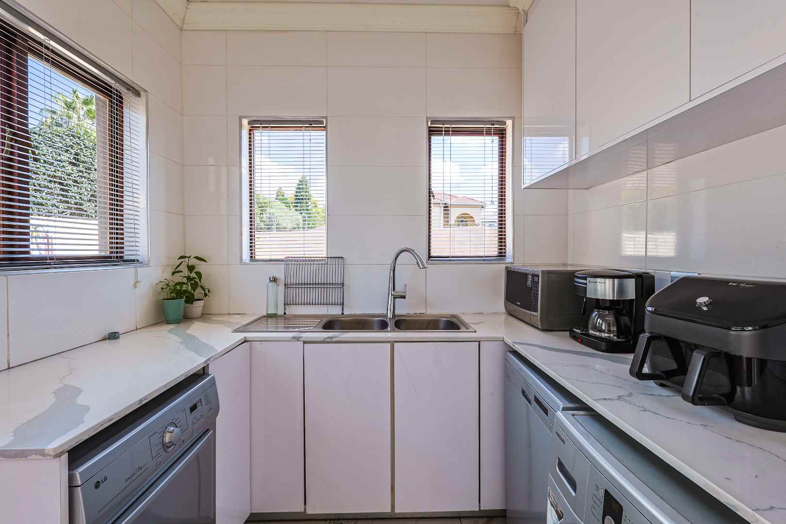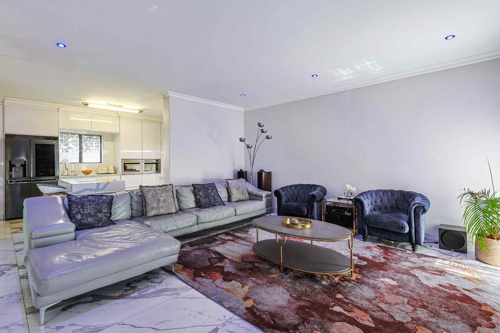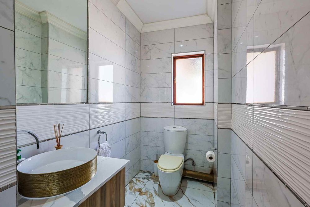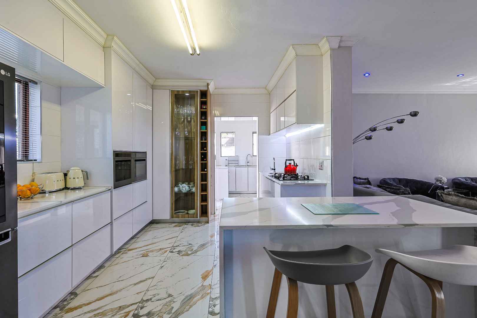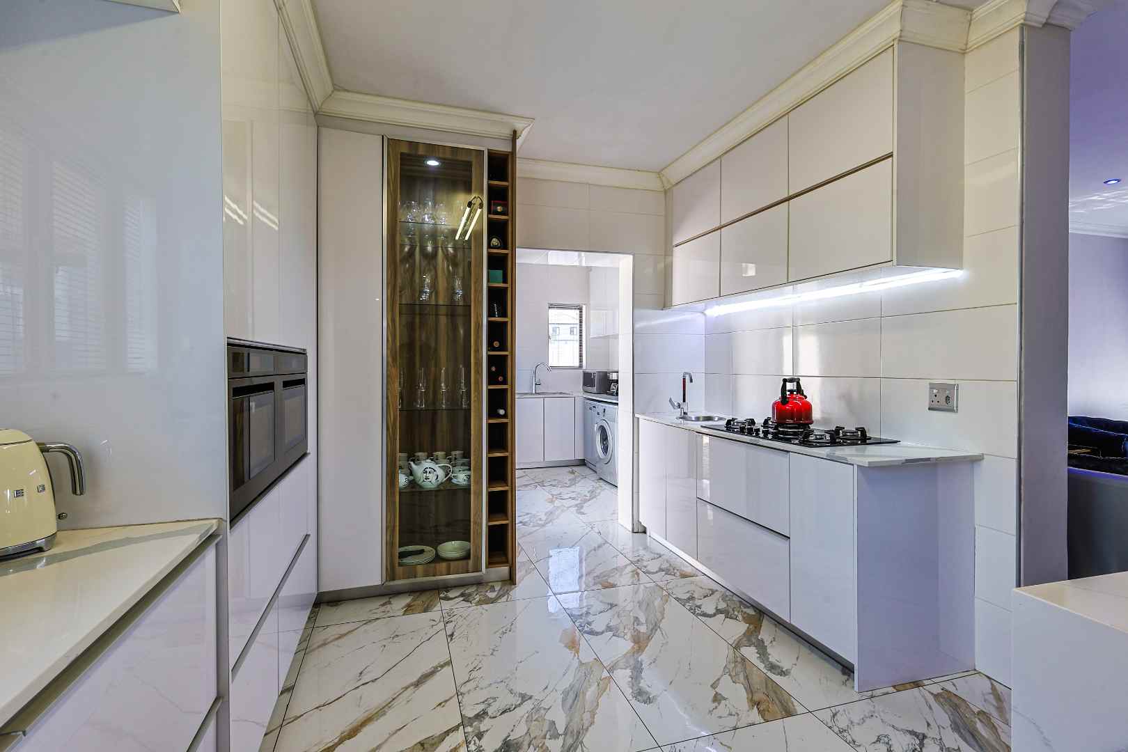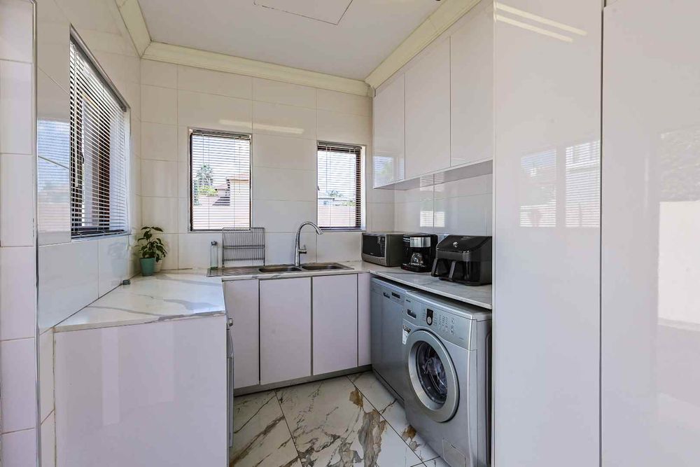 The modern kitchen is fitted with granite countertops, a breakfast nook, and a 5-plate gas hob, complemented by a separate scullery with space for three appliances.