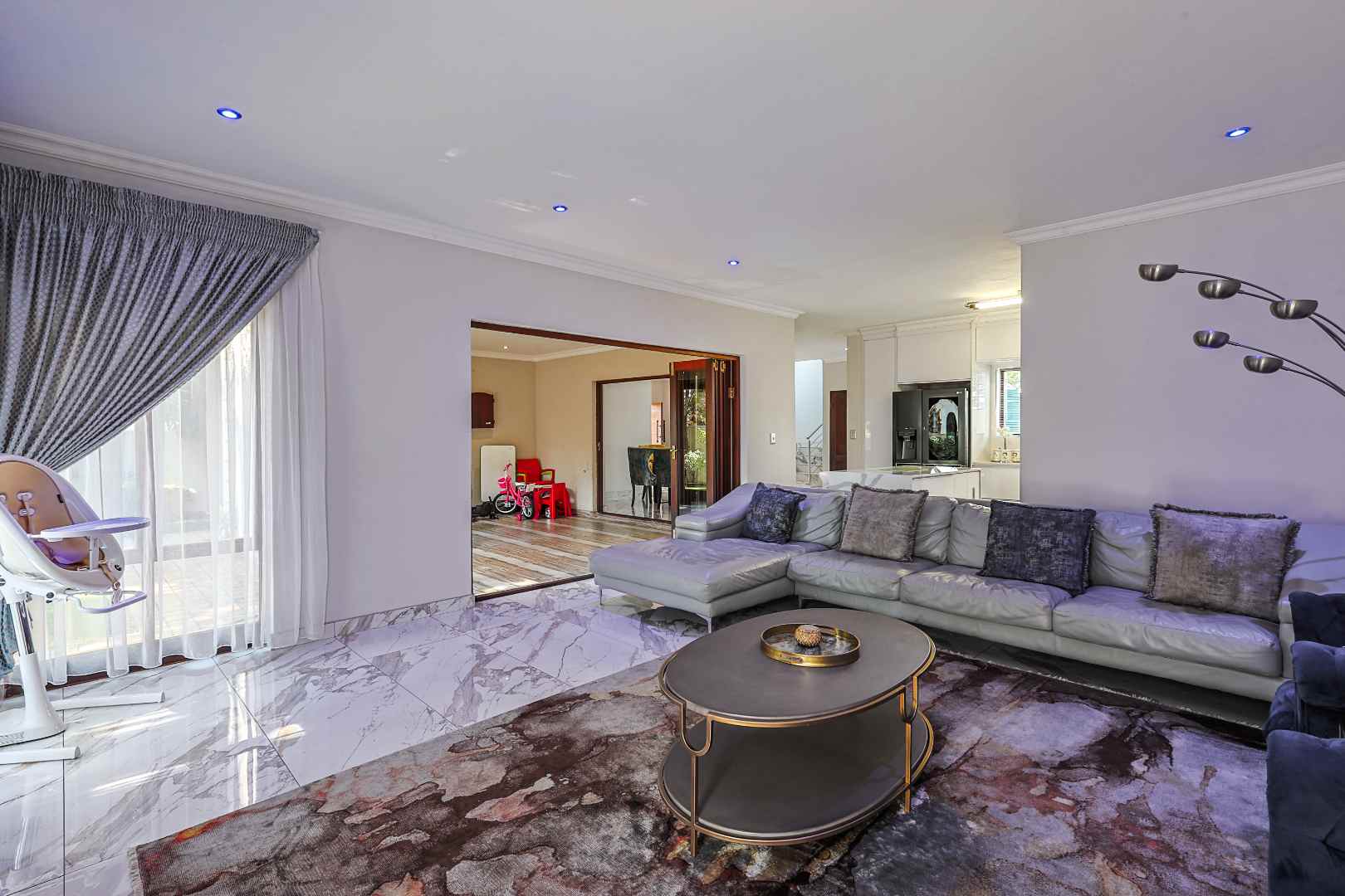 Upon entering, you are welcomed by a functional layout. To the left, you’ll find direct access to three automated garages, along with a convenient guest toilet. To the right, a cozy TV lounge with a fireplace creates the perfect space for relaxation.
