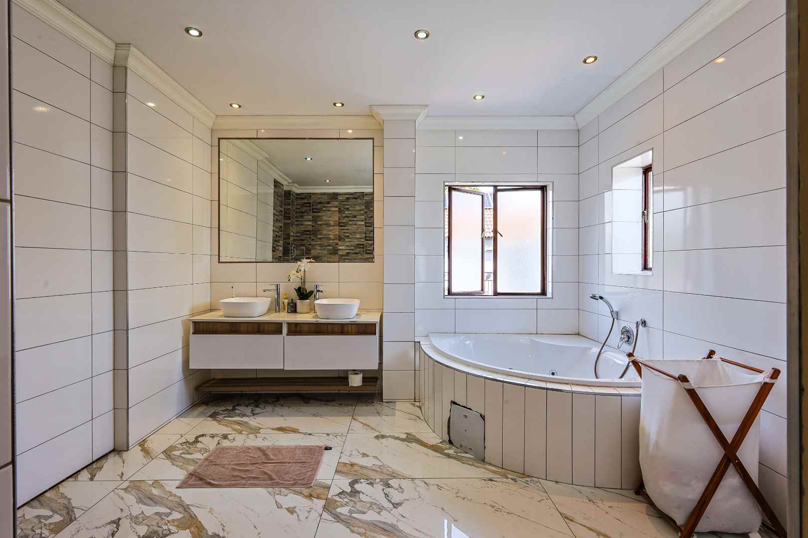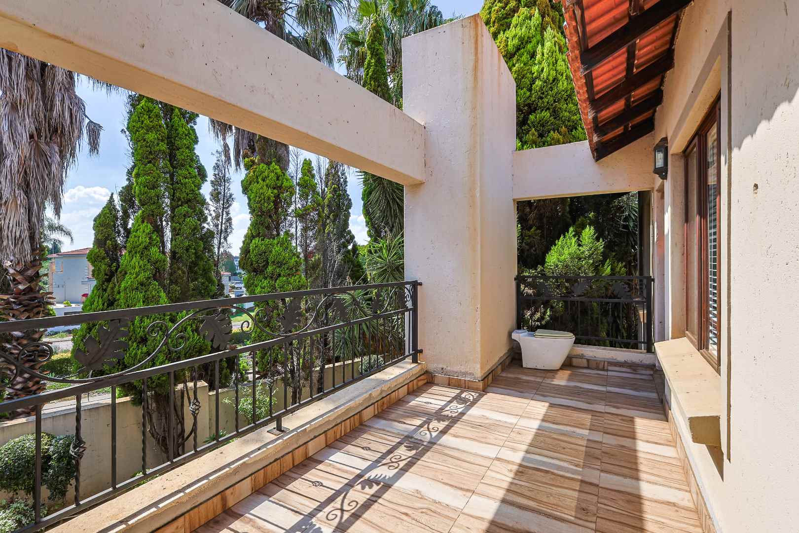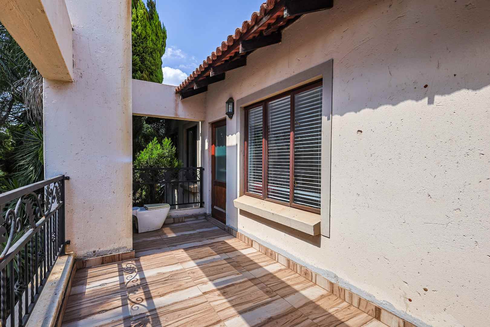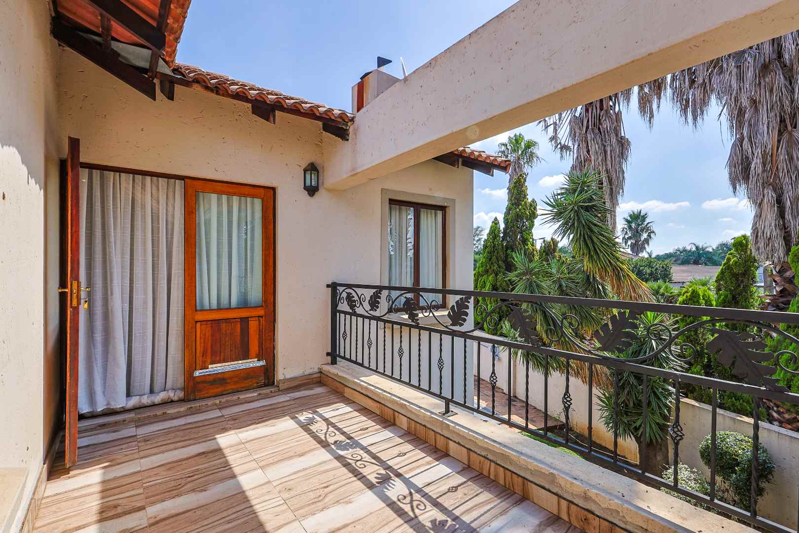 Main bedroom with a private balcony and full en-suite bathroom, including a corner bath