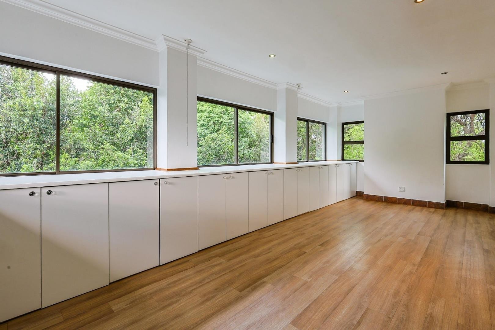 Large upstairs lounge with built-in cupboards and countertops