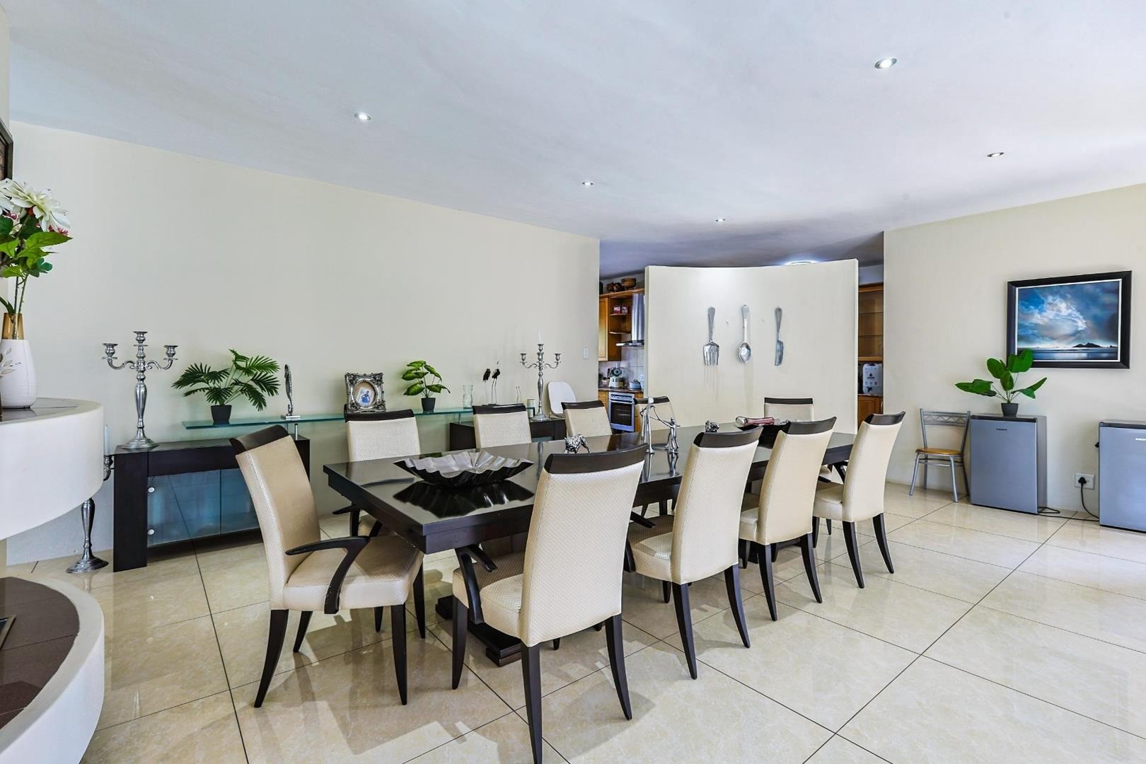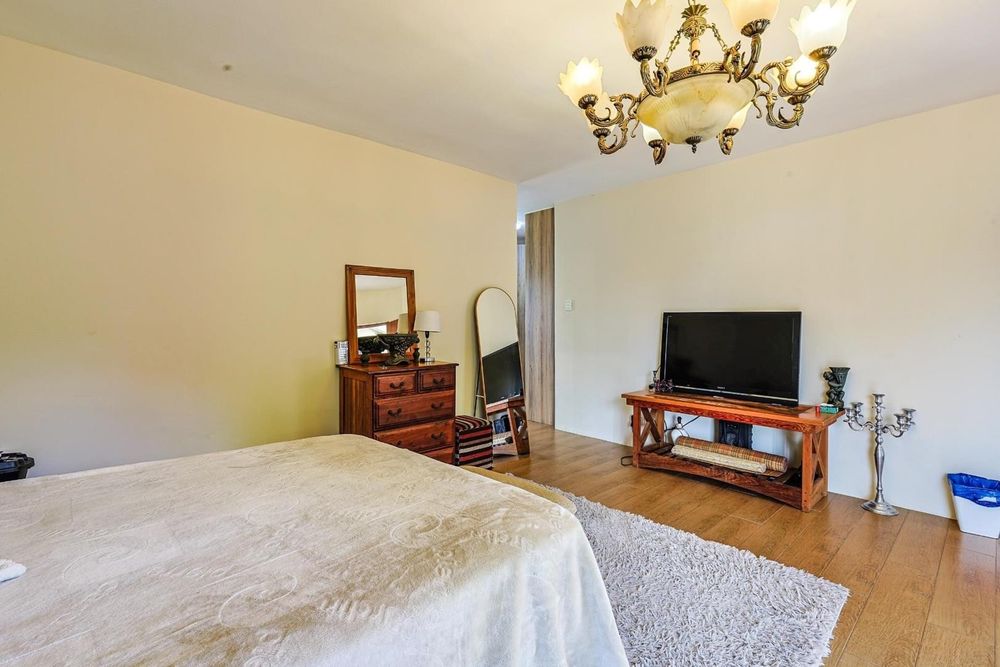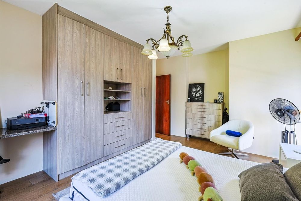 Downstairs features a guest toilet upon entry, a bedroom with a full en-suite bathroom, and a second bedroom. The home boasts a dining area and lounge that open seamlessly onto the garden and swimming pool. A cozy TV/family room with a fireplace adds warmth and charm. The modern kitchen is fitted with granite countertops, a breakfast nook, walk-in pantry, electric stove and oven, and a separate scullery. Additional accommodation includes domestic quarters with an en-suite shower bathroom. A triple automated garage provides secure parking.