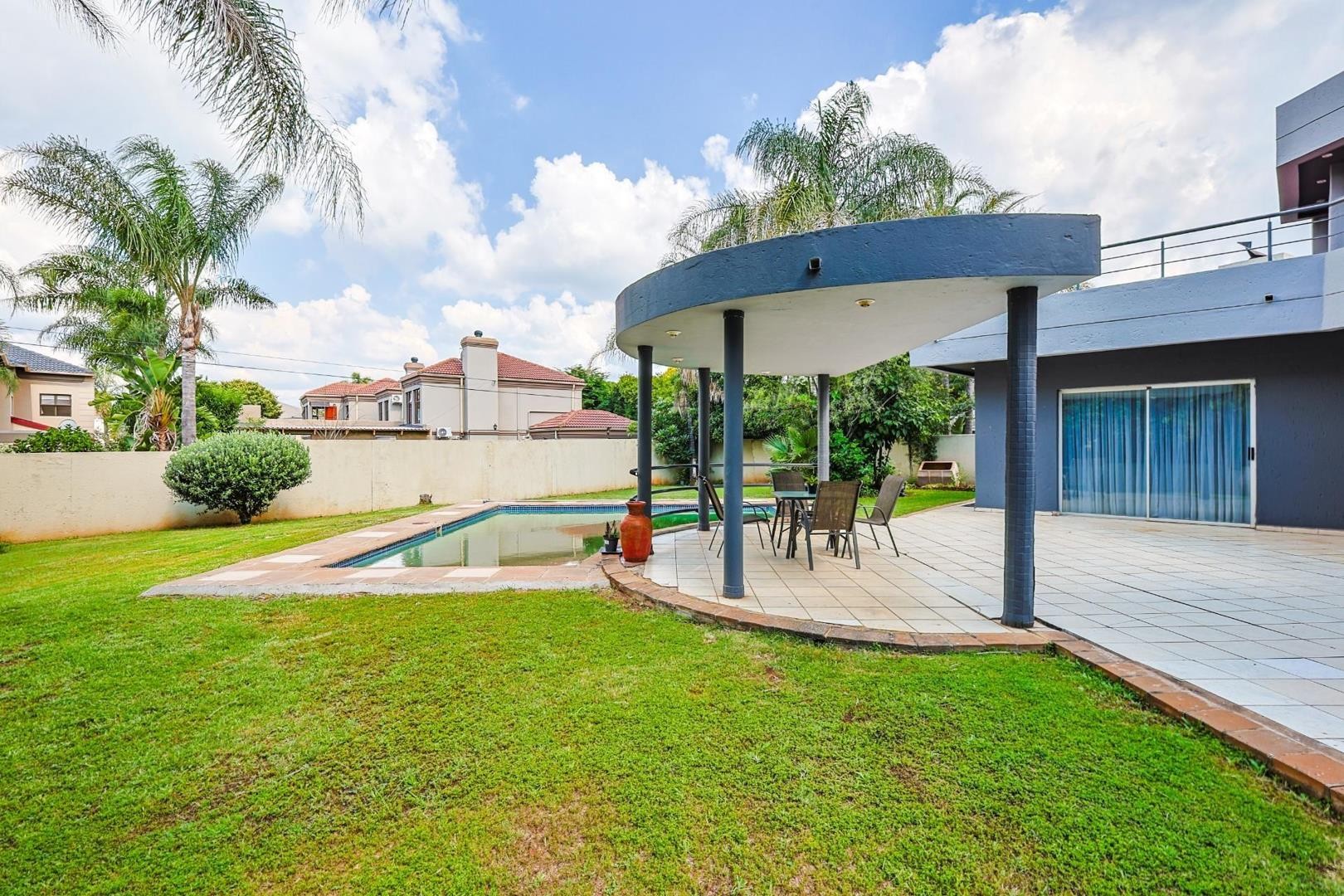 The outdoor area features a swimming pool, built-in braai, and a covered entertainment space, ideal for hosting guests.