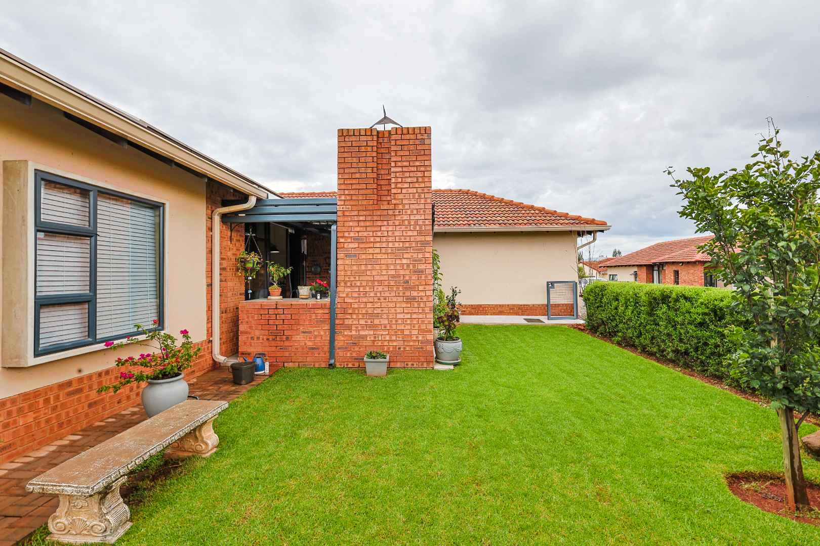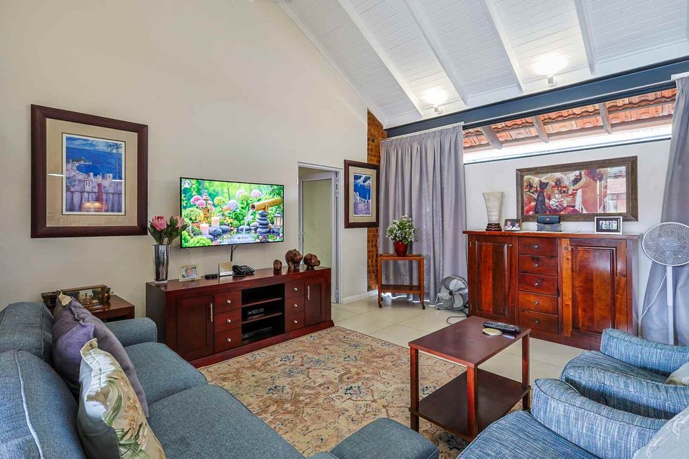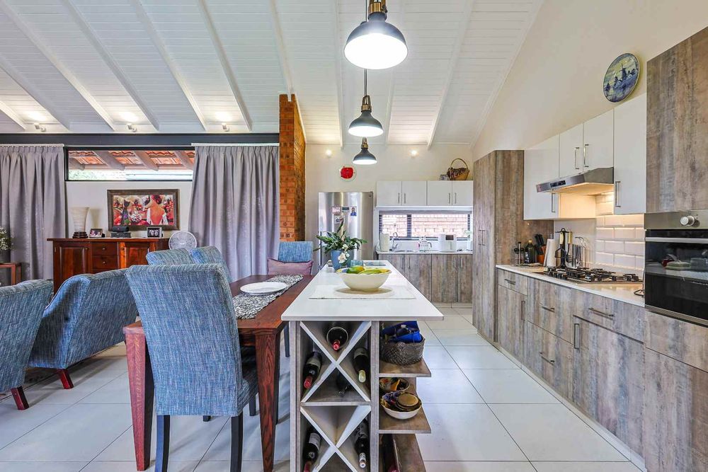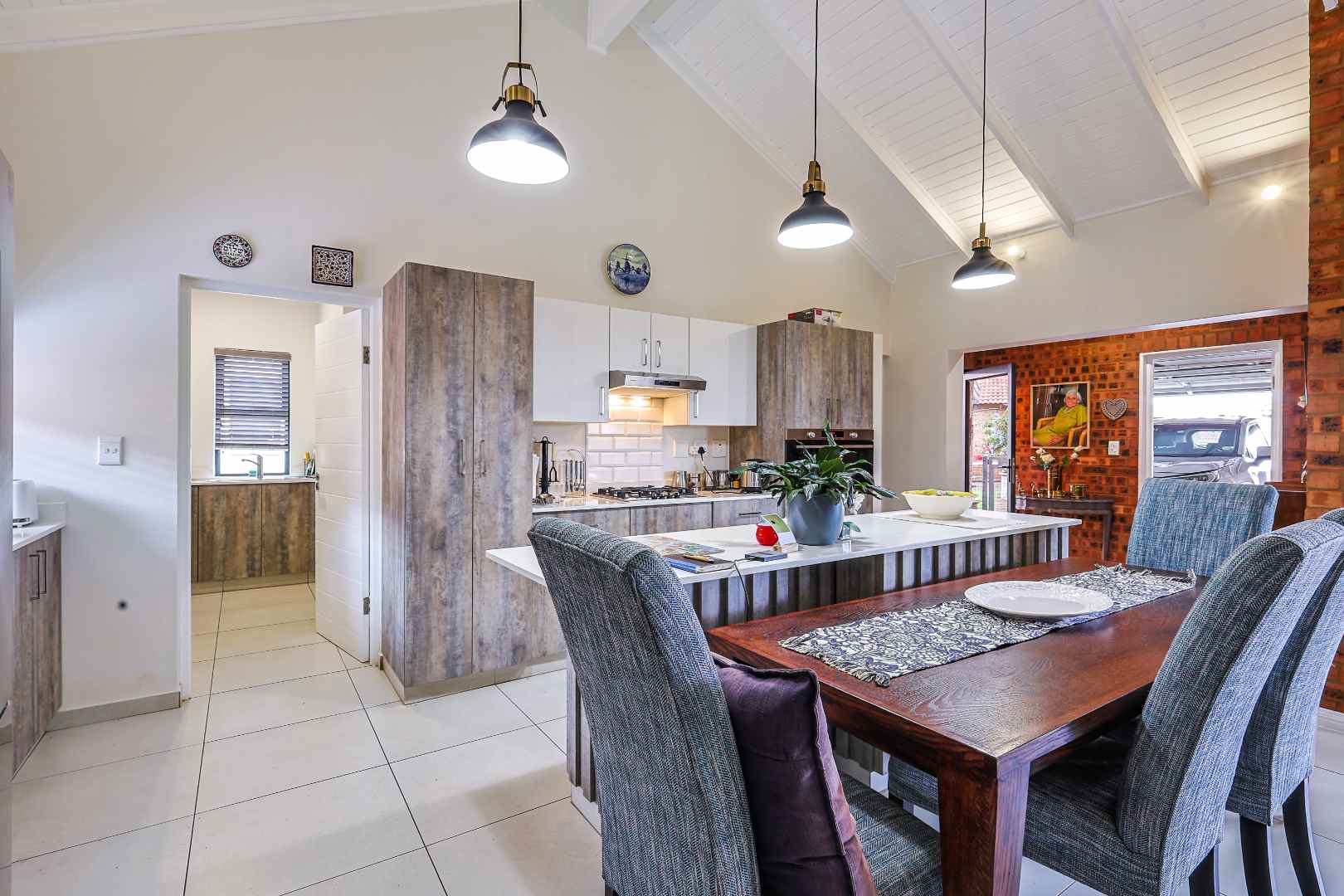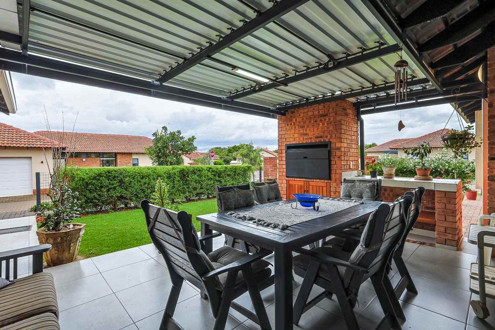 Sliding doors open onto a covered patio fitted with non-slip tiles and a built-in braai, overlooking a beautifully maintained and private garden — the perfect space for relaxing or entertaining.