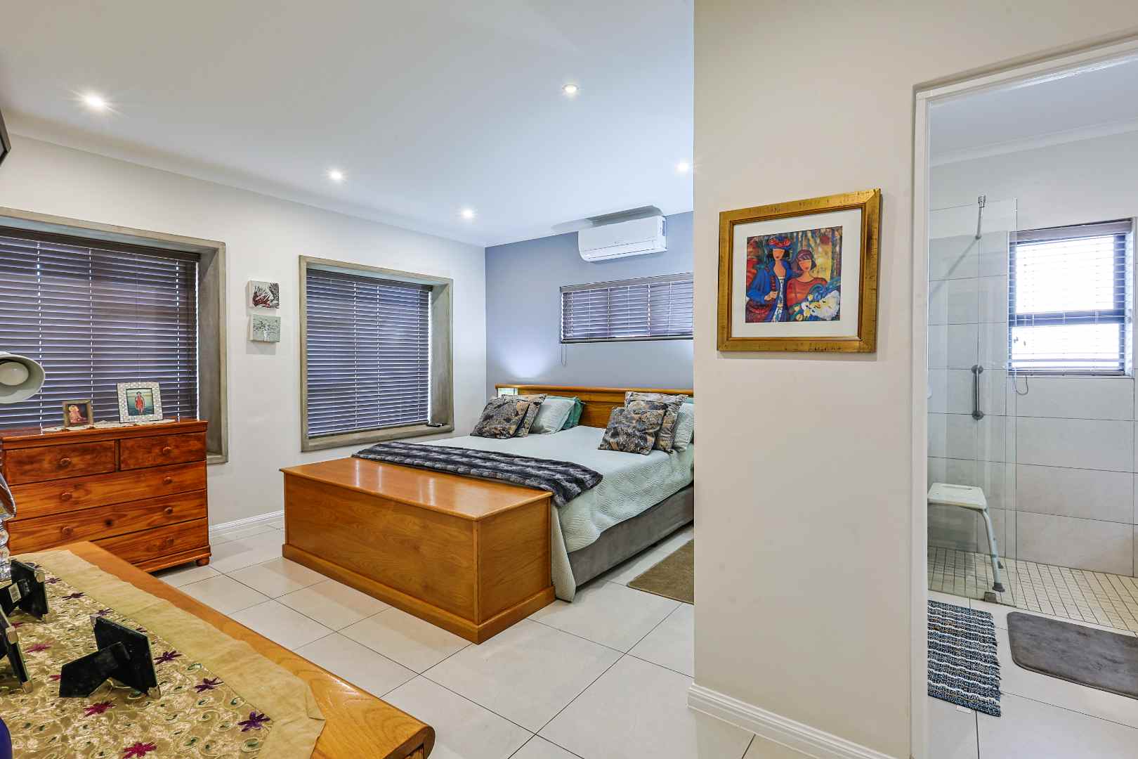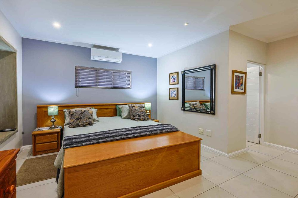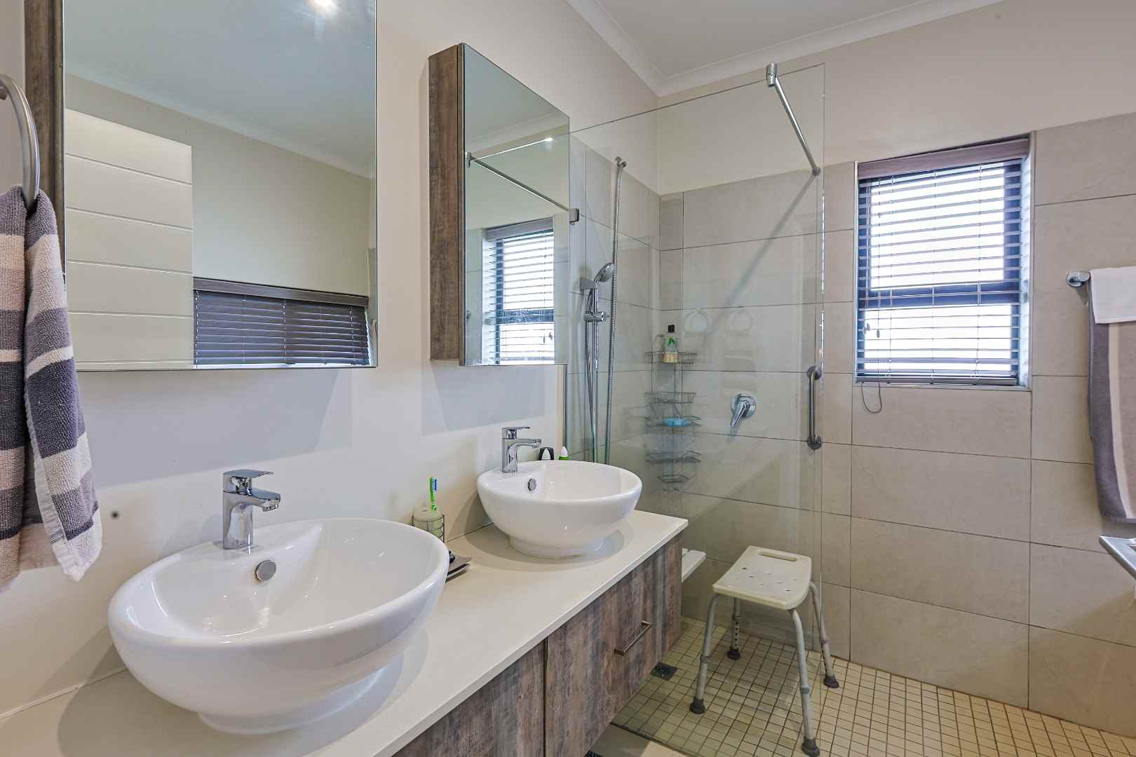 The spacious main bedroom features air conditioning and a luxurious en-suite bathroom fitted with his-and-hers countertop basins, a bath, and a separate shower. The second bedroom is well-sized and is serviced by a separate bathroom with a shower, making it ideal for guests or family.