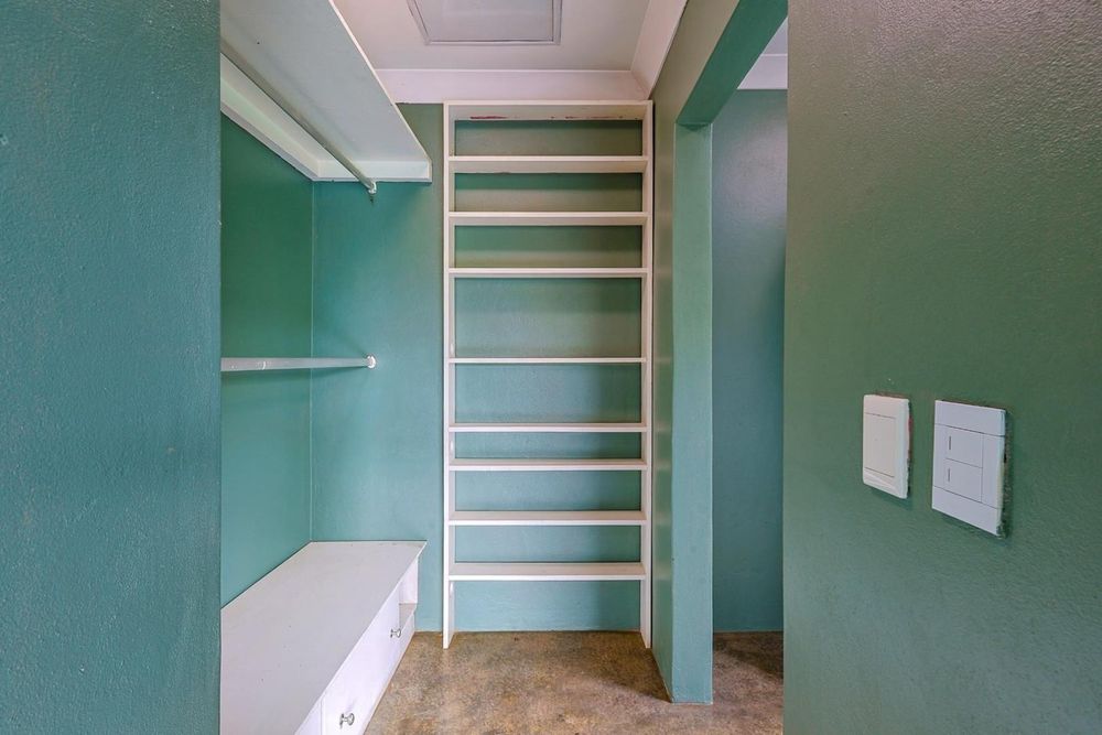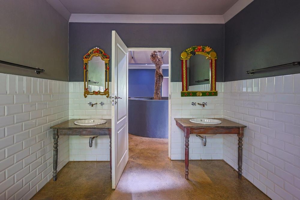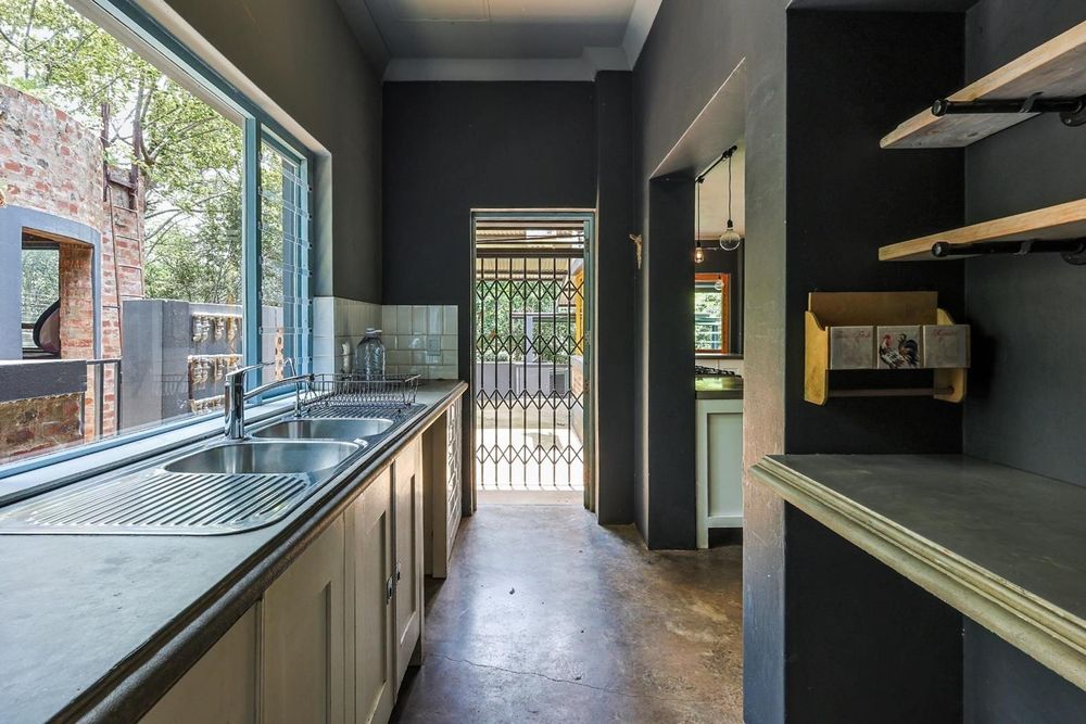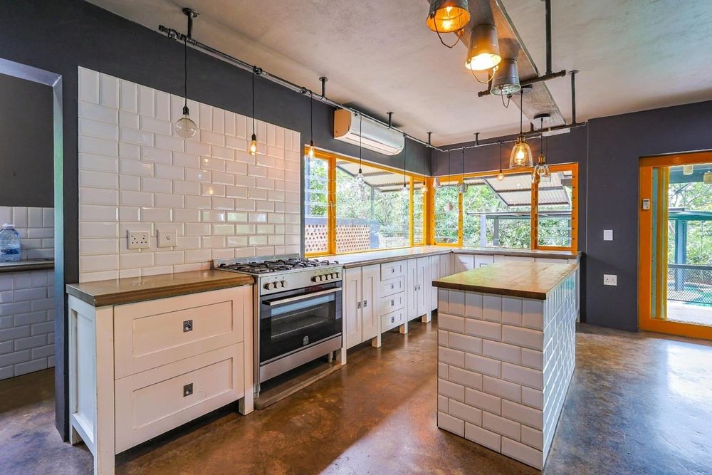 The kitchen is both stylish and functional, boasting wooden and cement countertops, a 5-plate gas oven and stove, two walk-in pantries, and a separate scullery with space for four appliances.