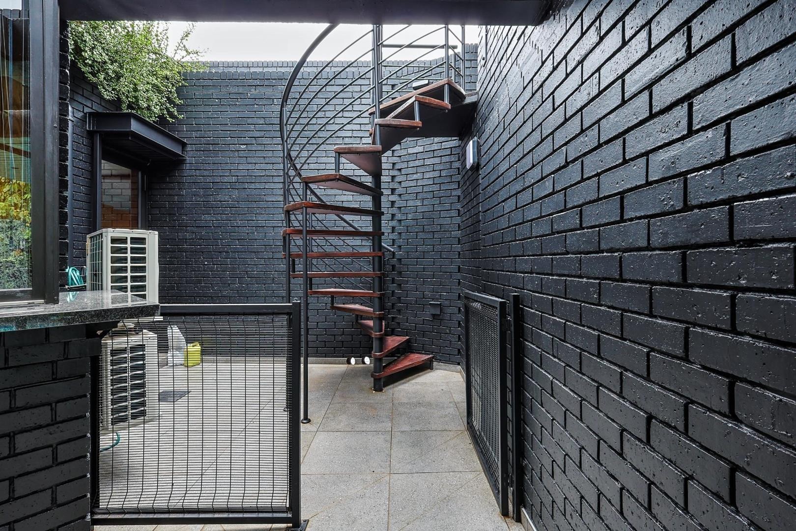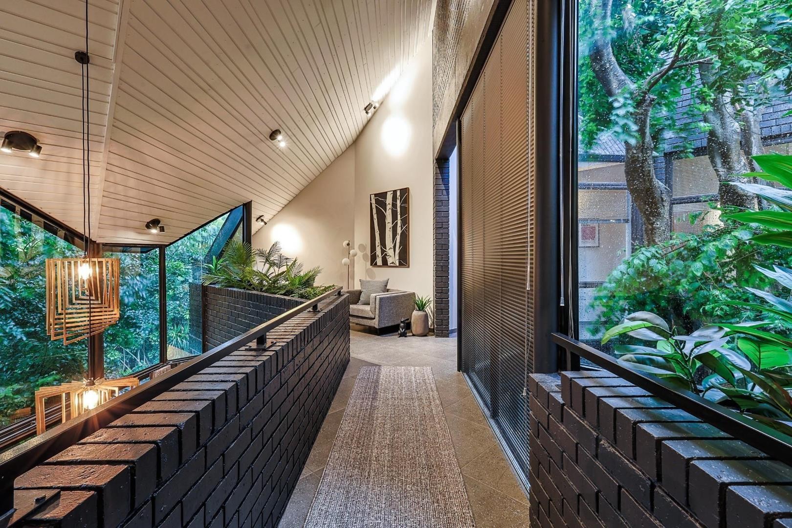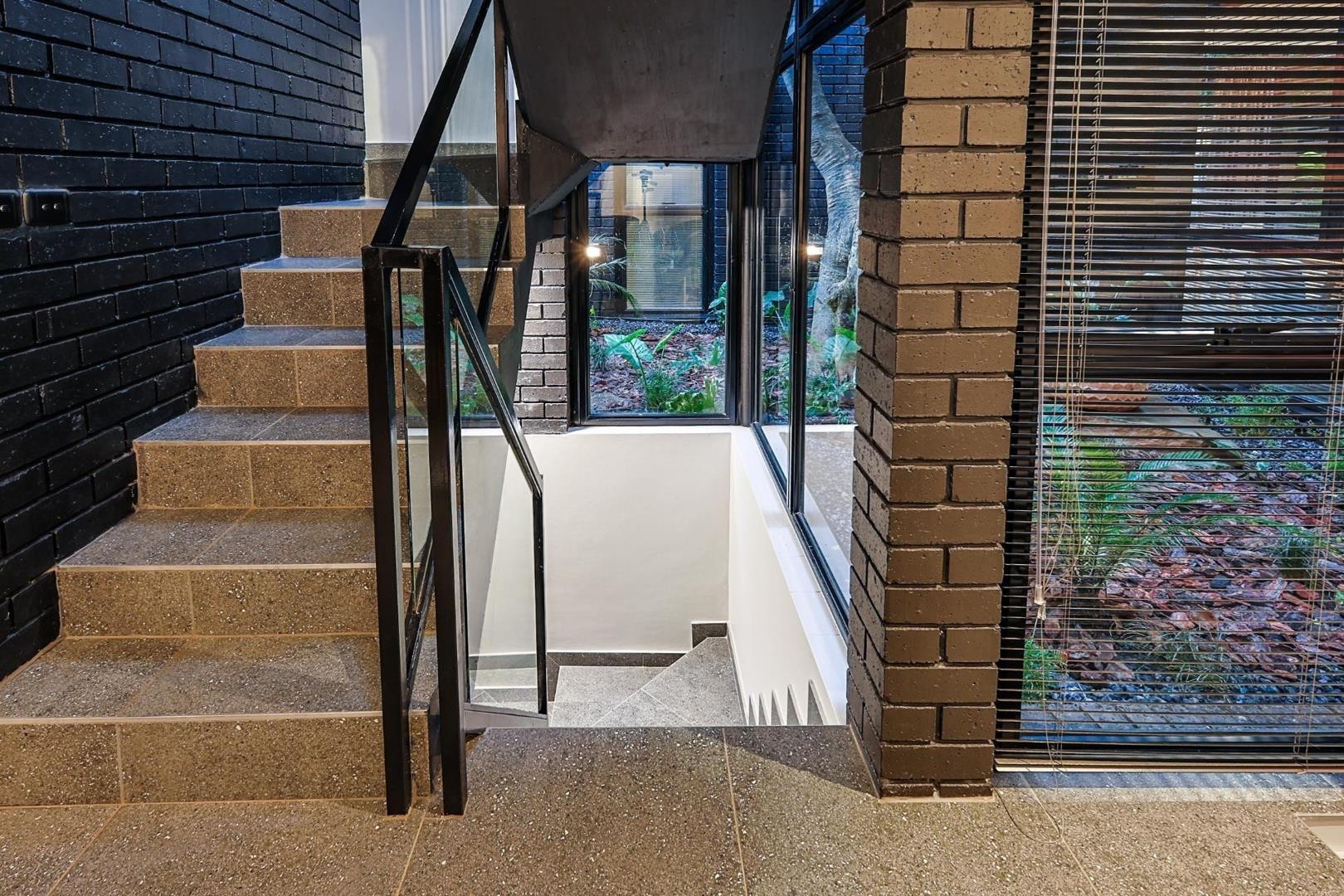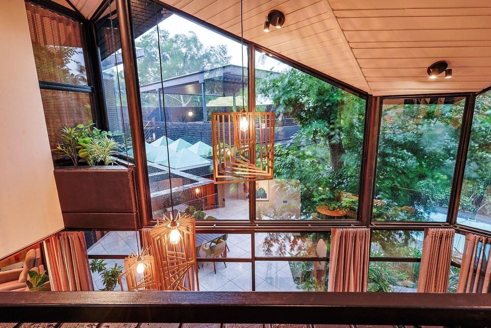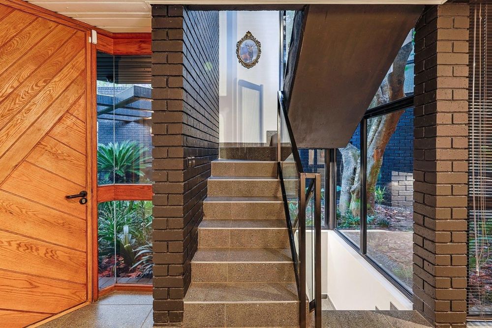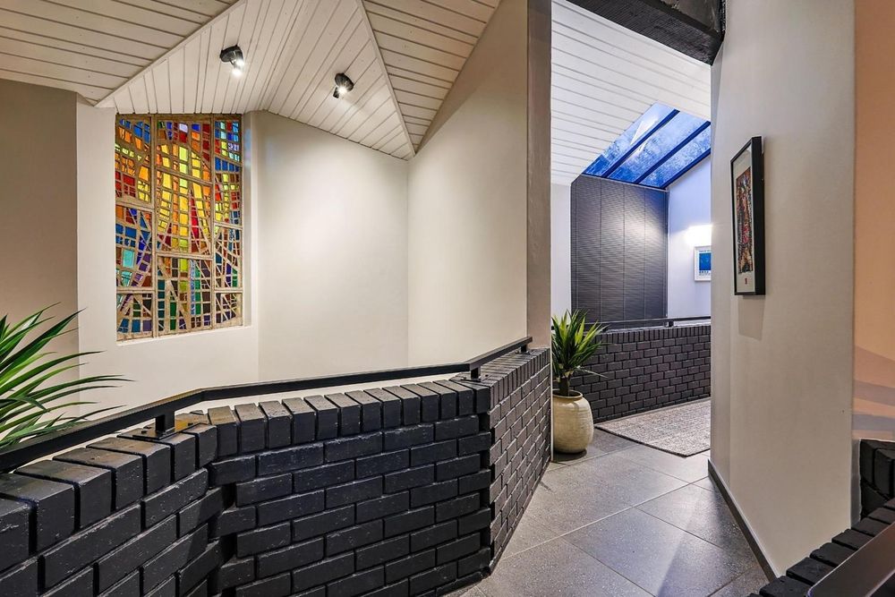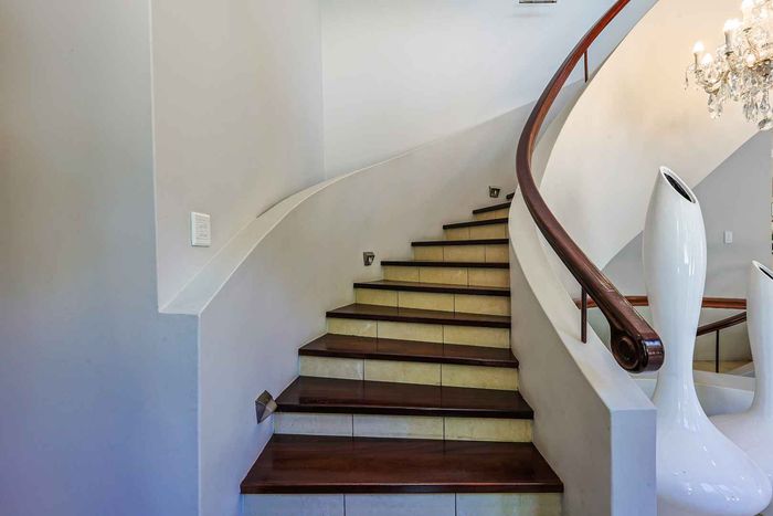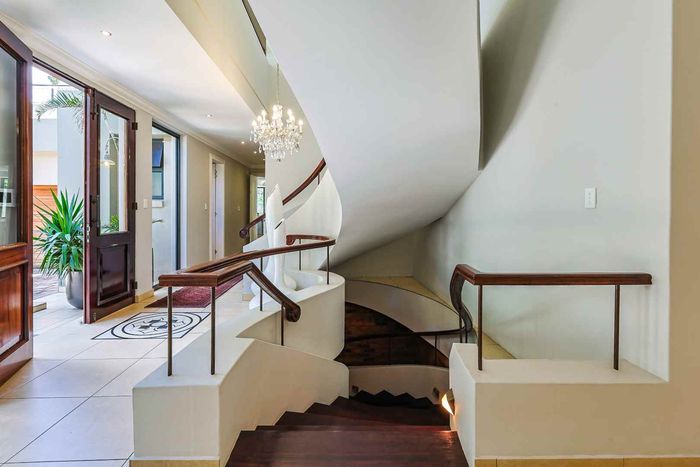 The Vista: A striking spiral staircase leads to an upper-level balcony, offering spectacular panoramic views over Waterkloof.