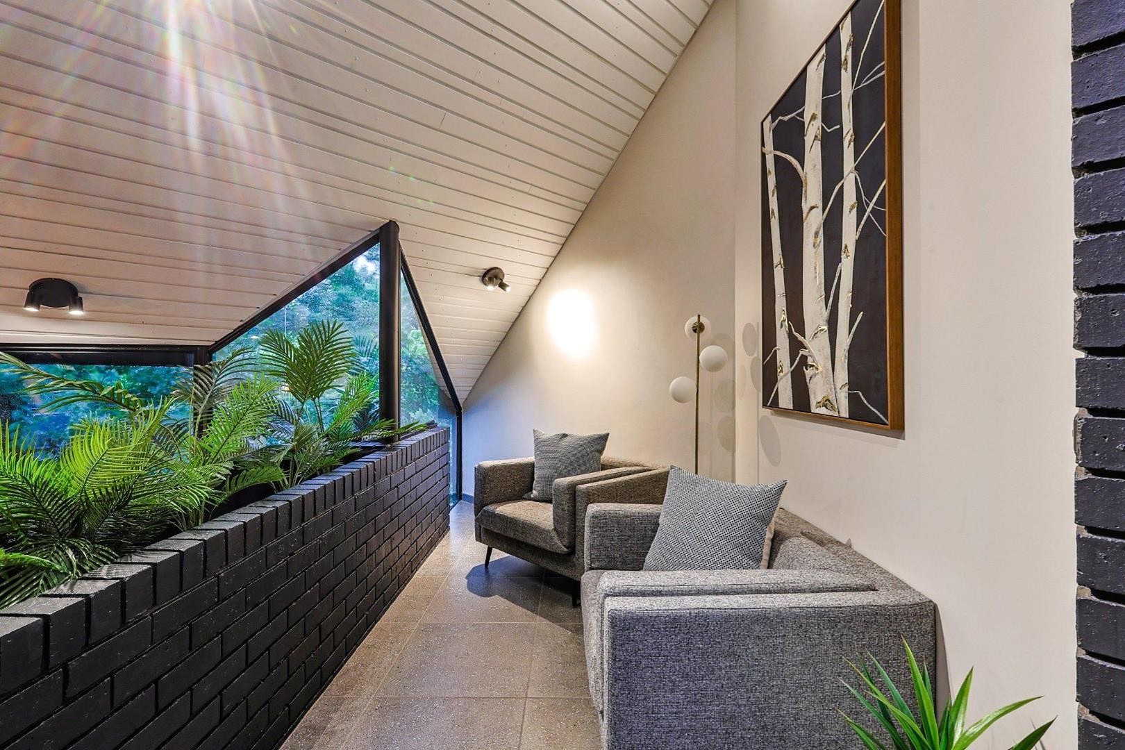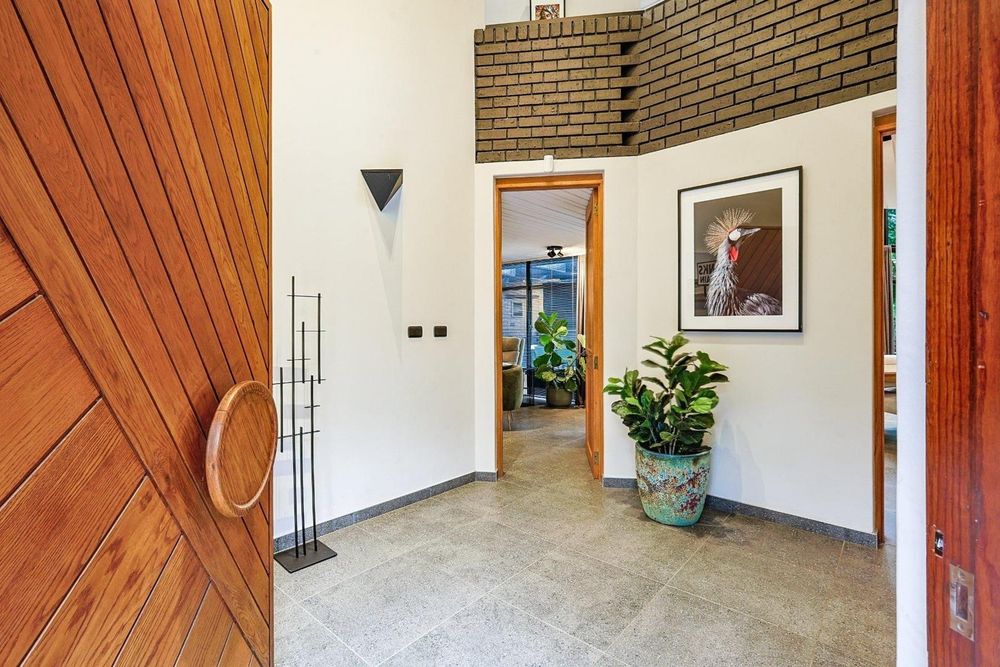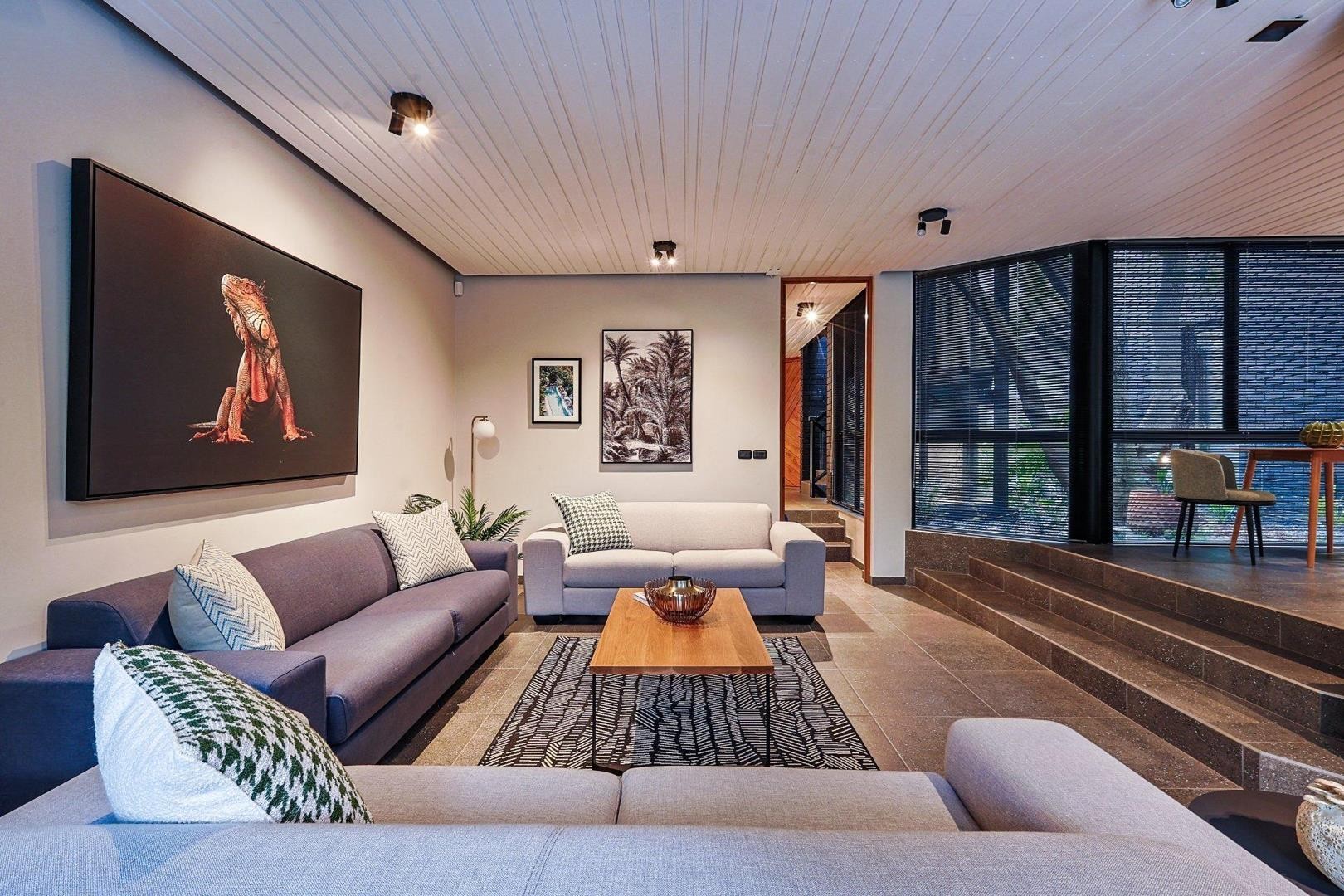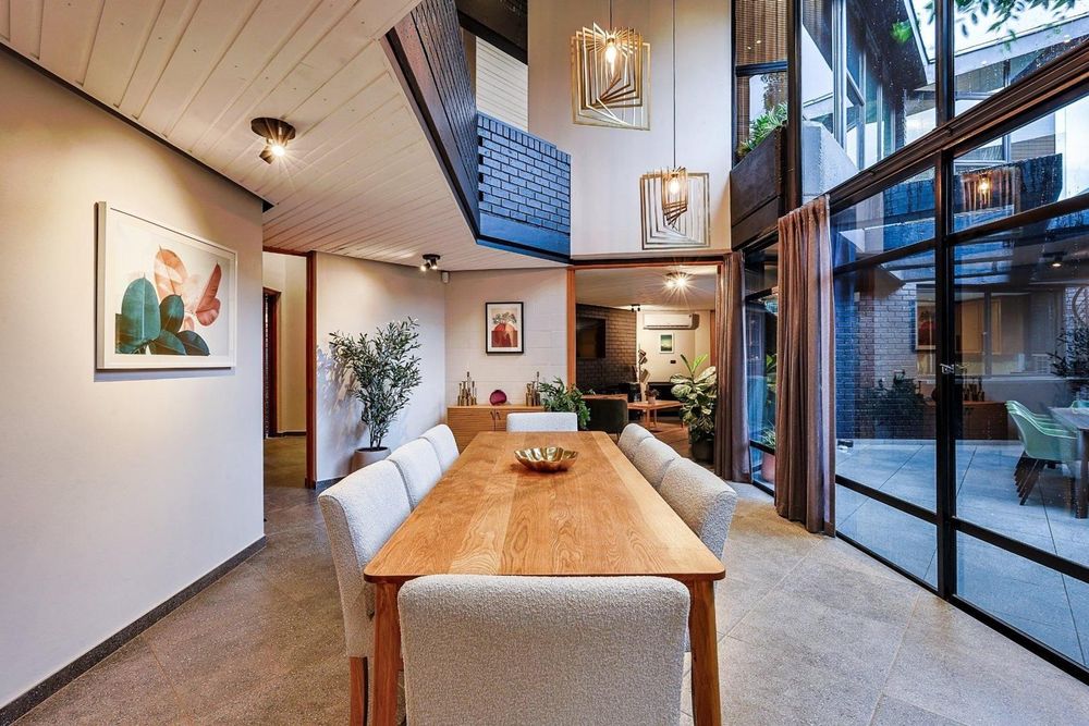 The home’s striking form is built upon the foundational excellence of high-performance double-cavity walls, providing a cocoon of tranquility, thermal efficiency, and soundproofing. The journey begins through a grand entrance framed by custom lead-glass detailing, leading into dramatic, light-filled spaces, including a breathtaking double-volume indoor dining hall—a stage set for unforgettable moments.