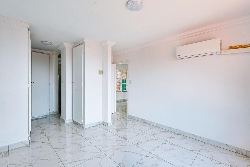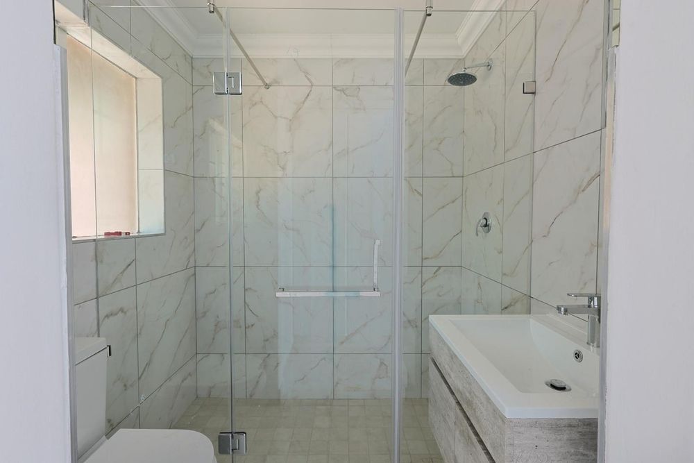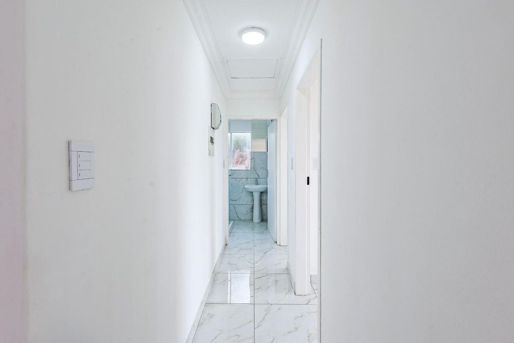 The main bedroom, located to the left, includes air conditioning, a walk-in closet, and a luxurious ensuite bathroom with a shower. To the right, you’ll find two additional bedrooms sharing a second bathroom with a shower.