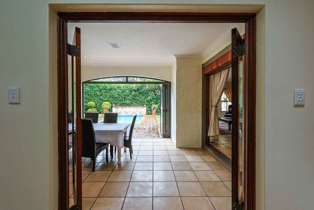 Moving through the home, the layout opens beautifully to the left where the open-plan lounge with a fireplace invites relaxed living. The dining area flows seamlessly into the kitchen and opens through doors onto a covered patio with a built-in braai, overlooking the sparkling pool and lush garden — the perfect setting for entertaining family and friends.